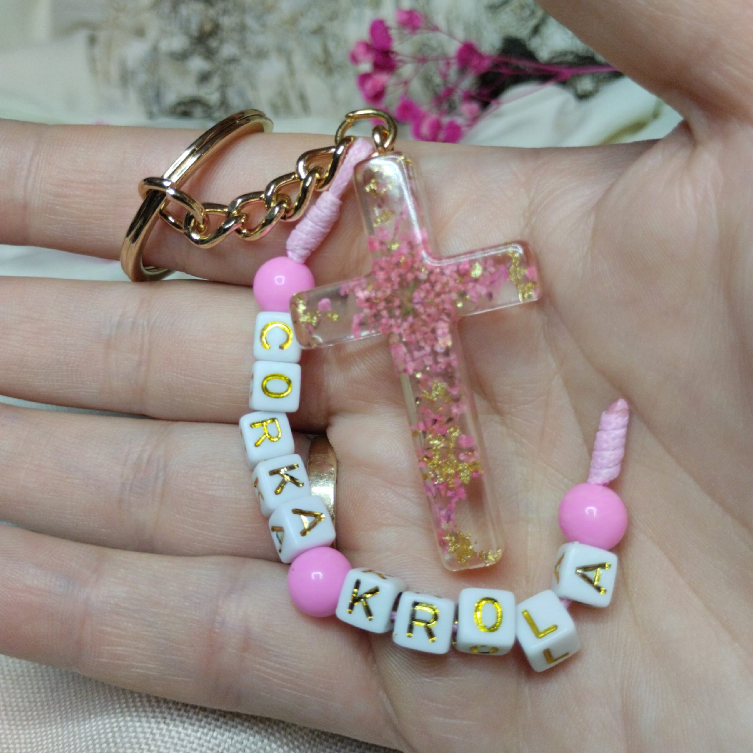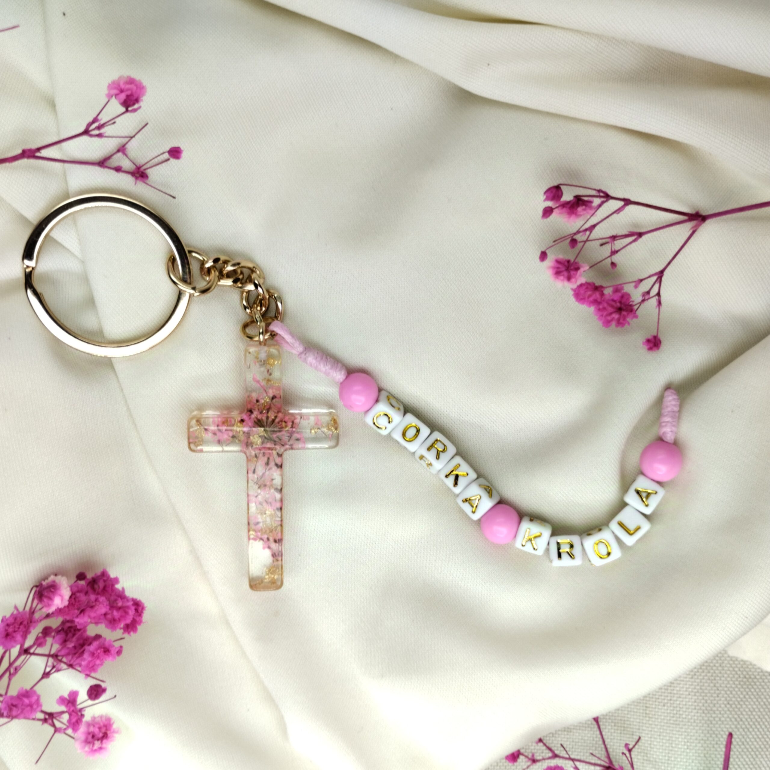 Idealny do kluczy, torebki czy kosmetyczki, to nie tylko praktyczny element, który będzie towarzyszyć Ci w codziennym życiu, ale dzięki słowom „Córka Króla” możesz czuć się przypomniana o Bożej miłości oraz swojej niezwykłej tożsamości.