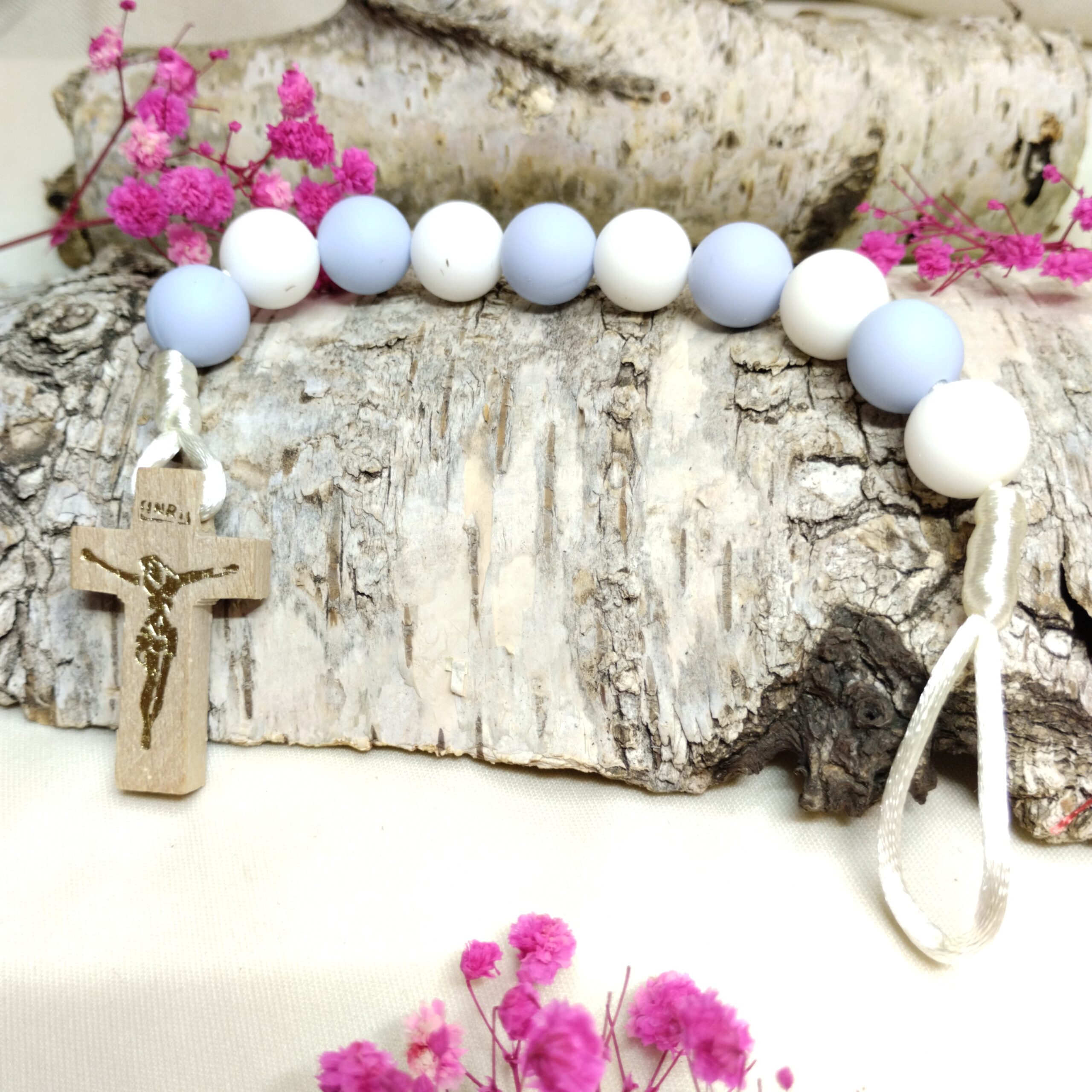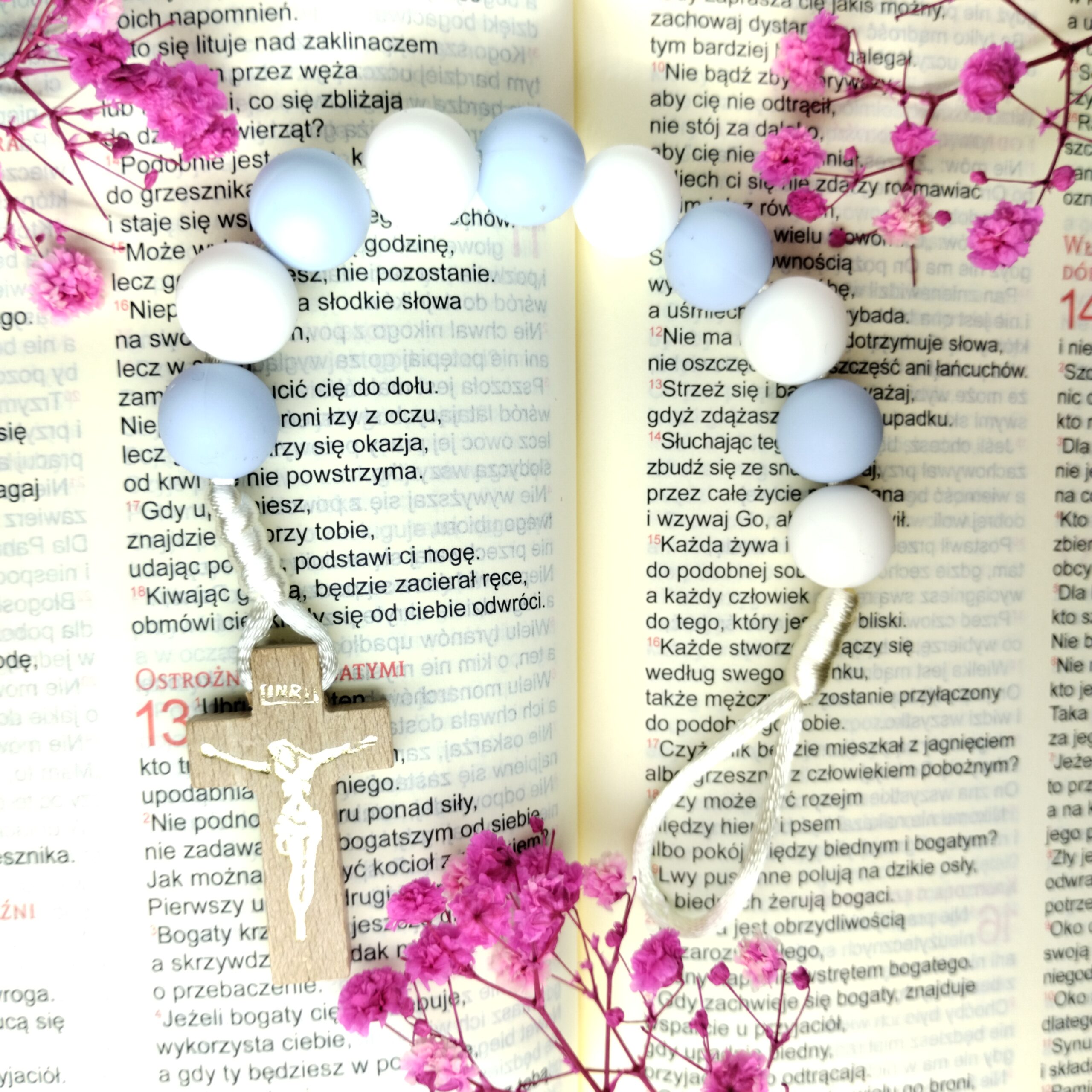Różaniec „Franciszek” delikatny i bezpieczny różaniec stworzony z myślą o dzieciach. Wykonany z silikonowych paciorków o średnicy 10 mm w kolorze białym i niebieskim, wolnych od BPA, dzięki czemu idealnie nadaje się do małych rączek. Krzyż wykonany z naturalnego drewna dodaje całości klasycznej elegancji, a perłowy sznurek zapewnia trwałość i estetykę.