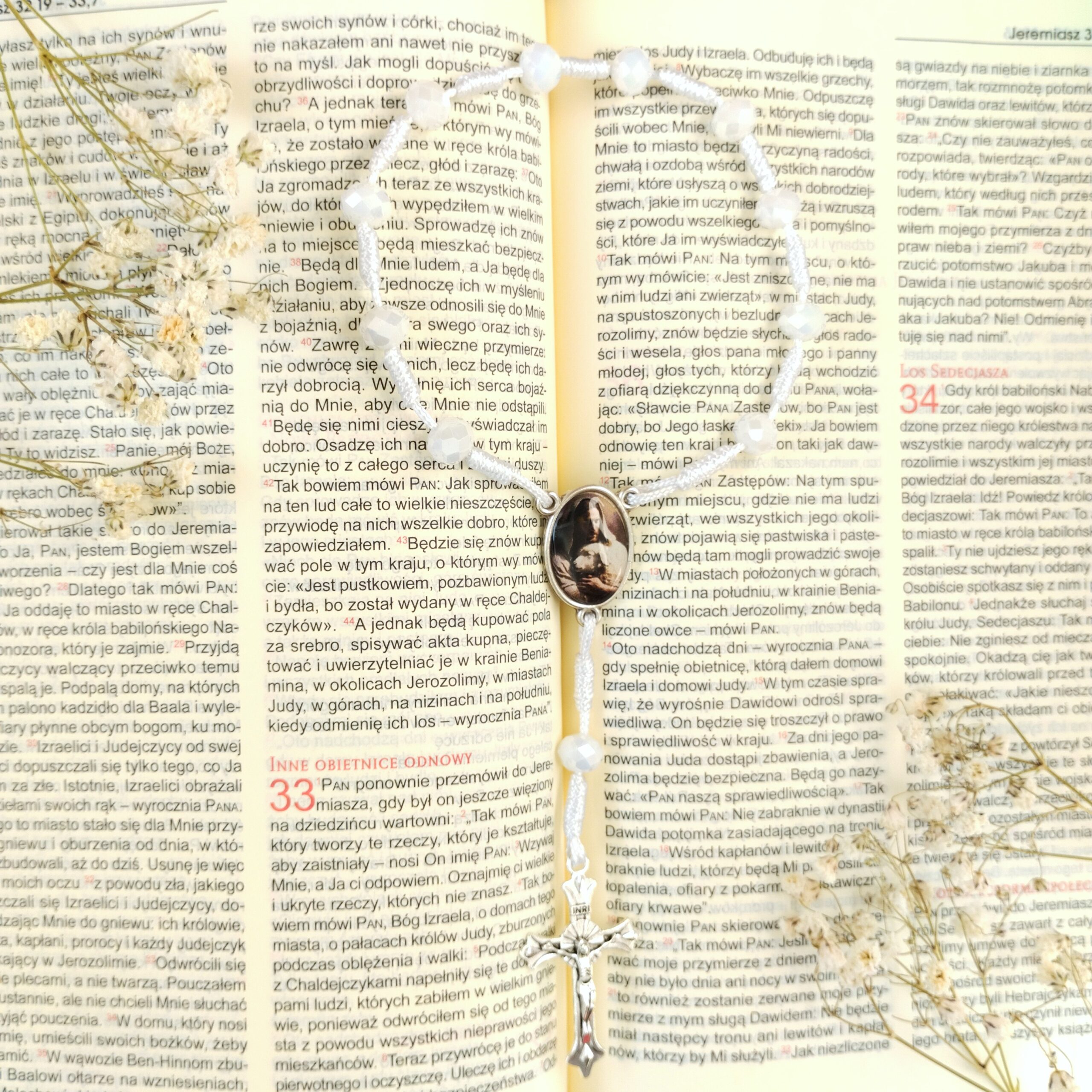 „Bliskość Jezusa” to subtelna i piękna pamiątka, która łączy w sobie prostotę i duchowe znaczenie. Wykonana z białych, szklanych, fasetowanych paciorków o średnicy 8mm, pięknie mieniących się w świetle – stanowi doskonały wybór na podziękowania dla gości z okazji Chrztu, Komunii Świętej, Roczku lub innych wyjątkowych uroczystości, ale jest także idealna dla maluchów – jako pierwszy różaniec.