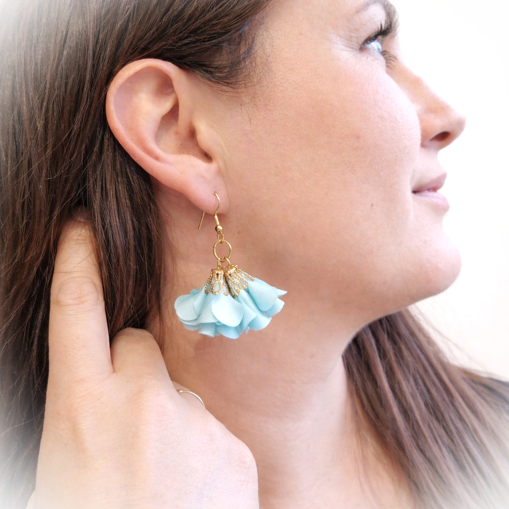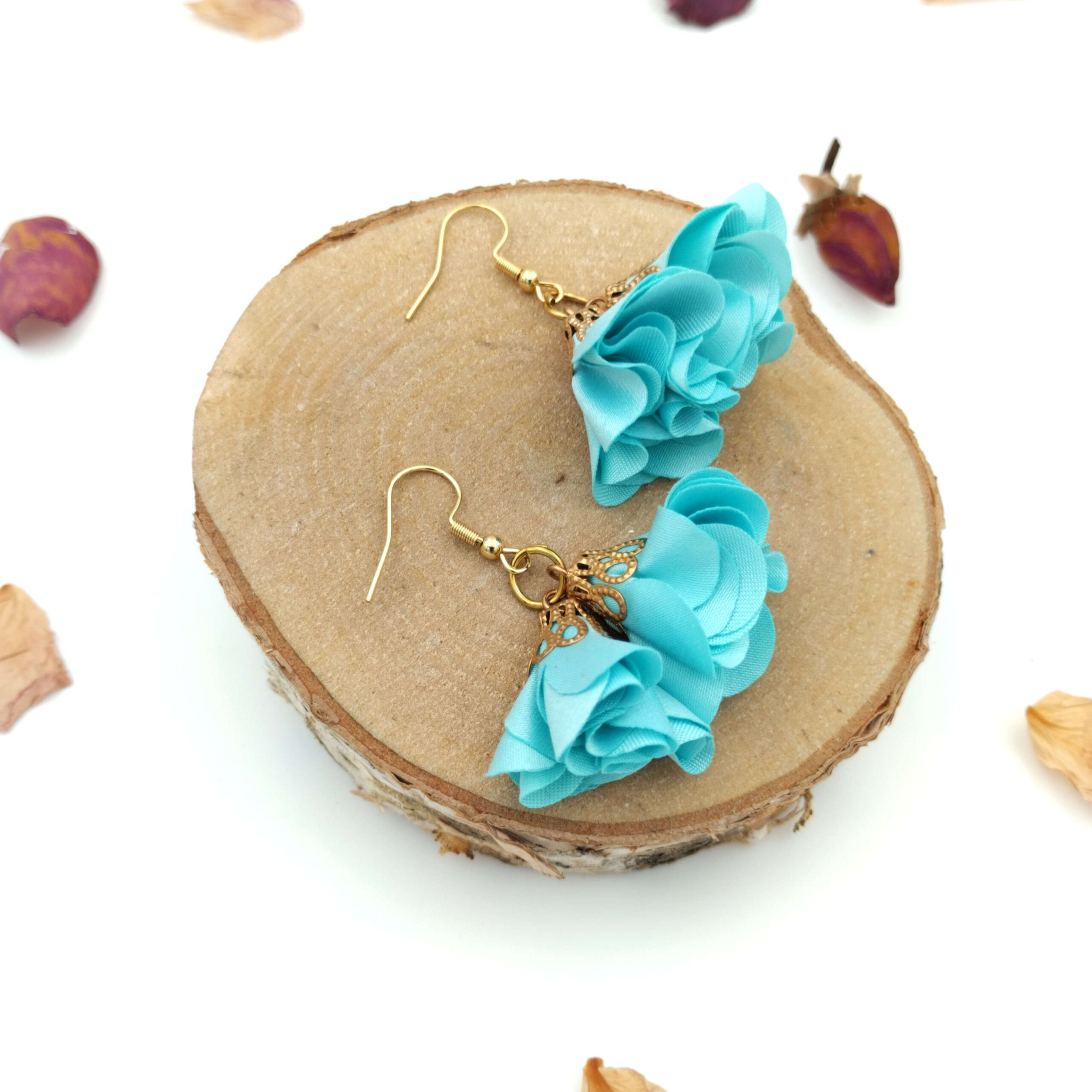 „Celestina” – lekkie, turkusowo-morskie kolczyki z dwoma kwiatowymi pąkami i ażurowym wykończeniem. Kobiece, świeże i eleganckie, pięknie rozświetlają stylizację.