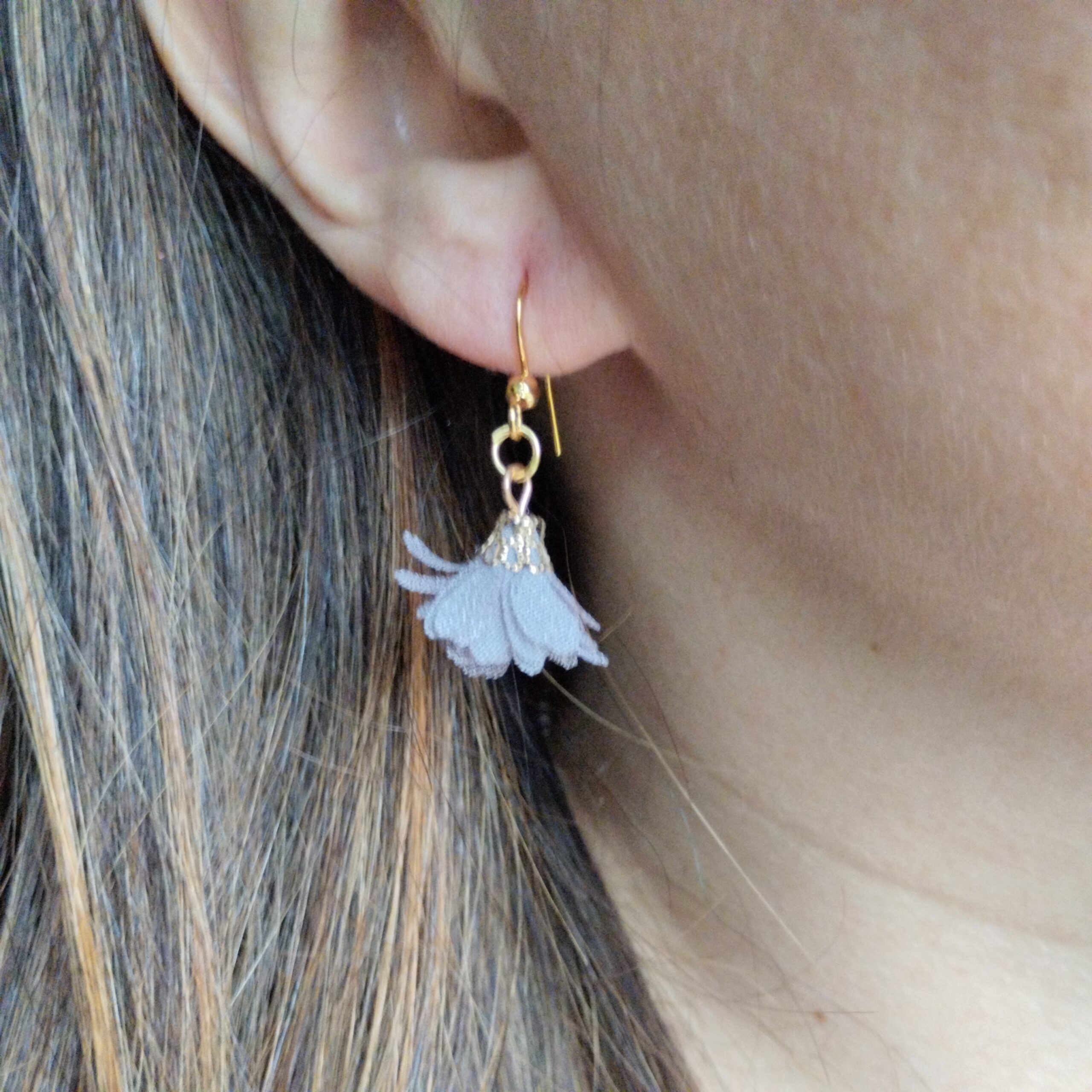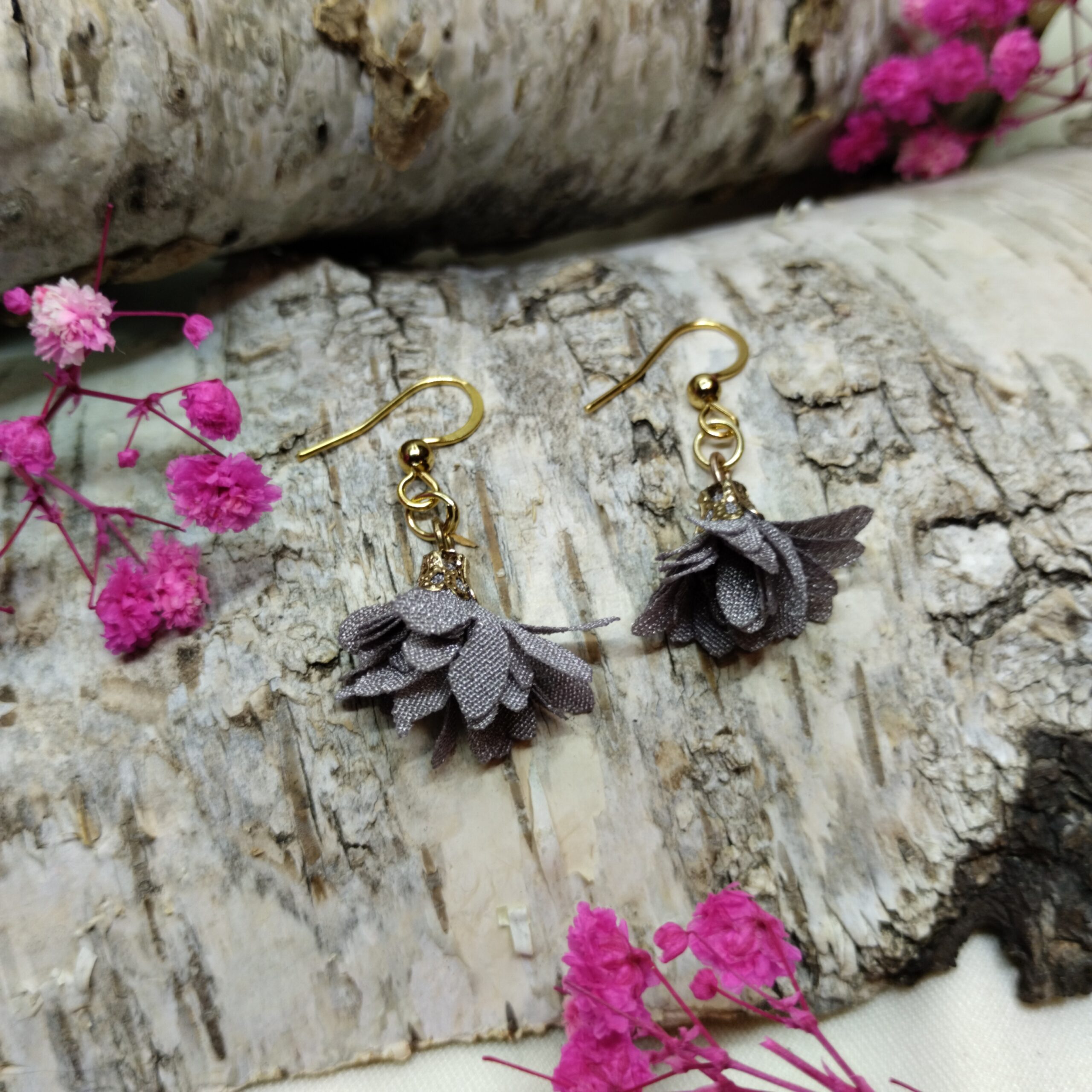 Kolczyki „Rozkwit” w kolorze szarymna biglu ze stali nierdzewnej, pozłacanej.