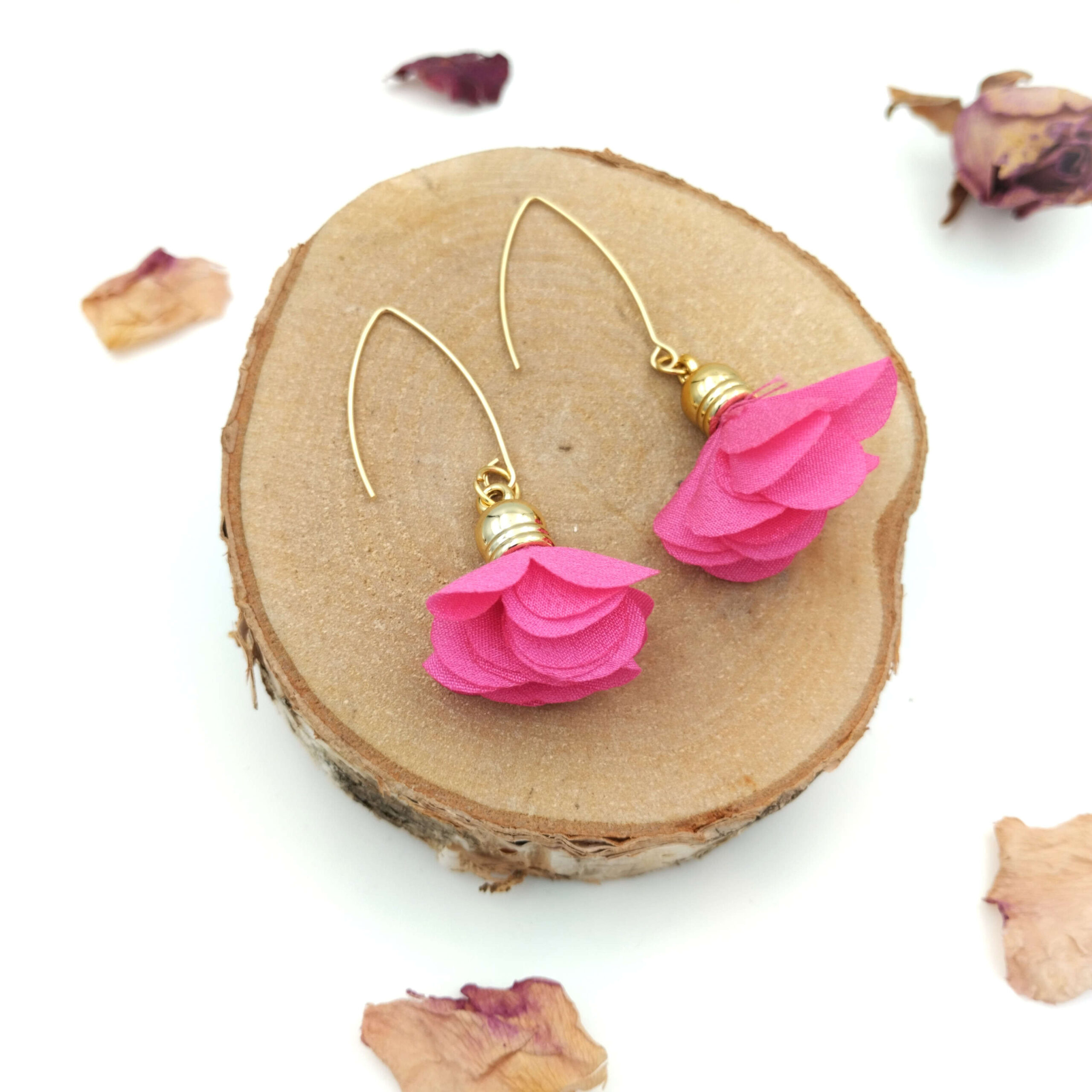 „Rosetta” – lekkie i efektowne kolczyki w soczystym różu z delikatnym złotym akcentem. Długie, kobiece i eleganckie, idealne na co dzień i wyjątkowe okazje, dodają stylizacji świeżości i blasku.