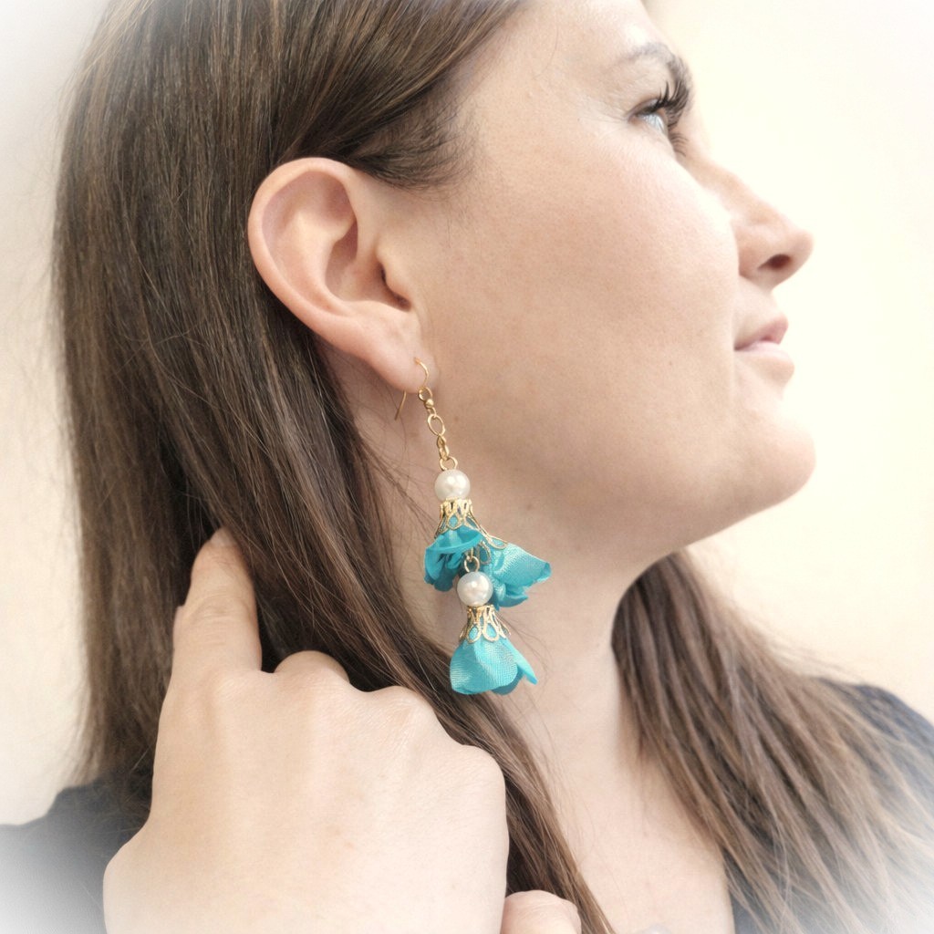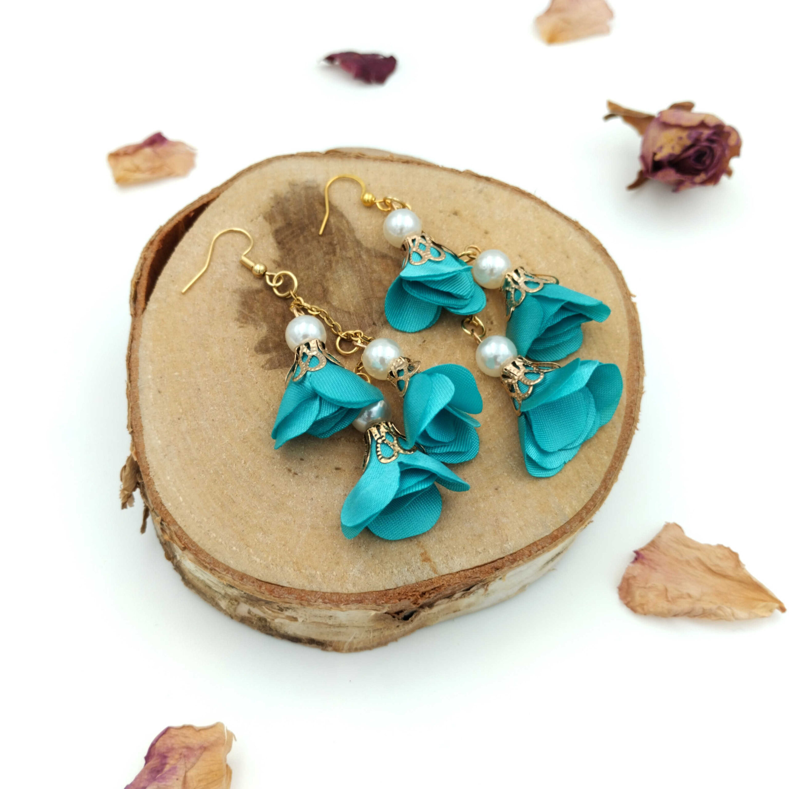 „Cascella” – długie, lekkie kolczyki z trzema turkusowymi kwiatami na złotym łańcuszku, wykończone elegancką perełką. Zwiewne, kobiece i pełne świeżości.