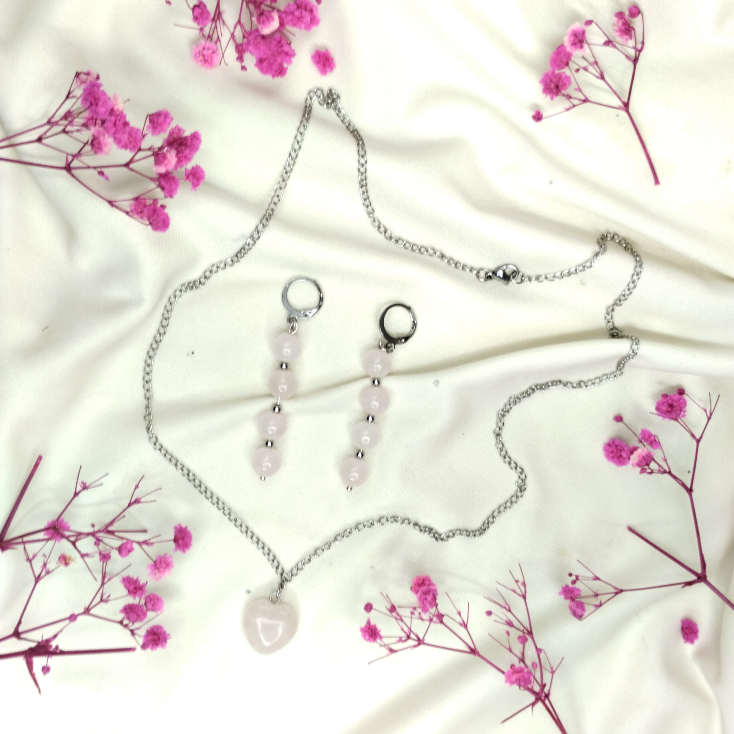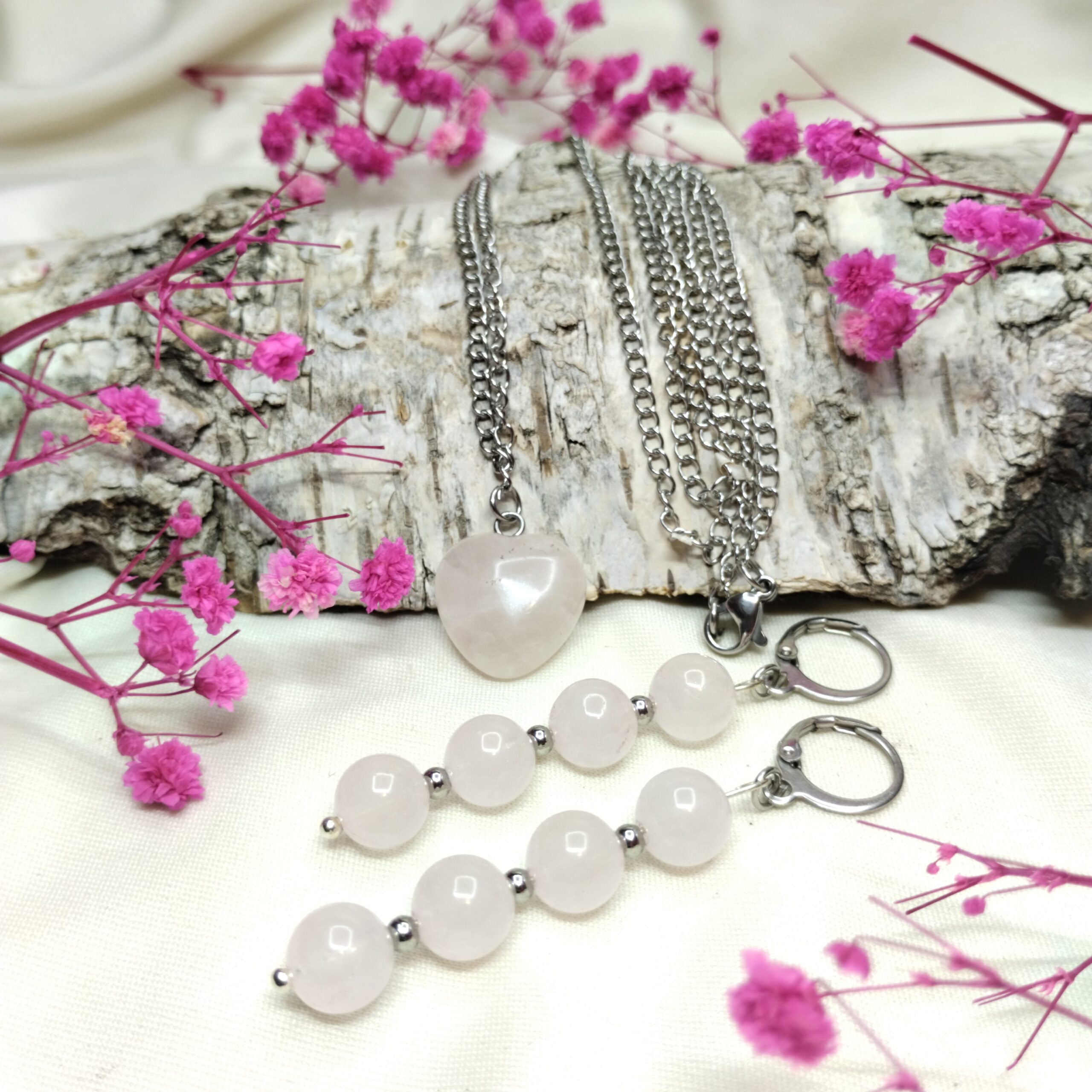 Komplet ten został wykonany z naturalnego kwarcu różowego, zestaw składa się z delikatnych kolczyków oraz naszyjnika, które podkreślają naturalne piękno kamienia i dodają romantycznego uroku każdej stylizacji.