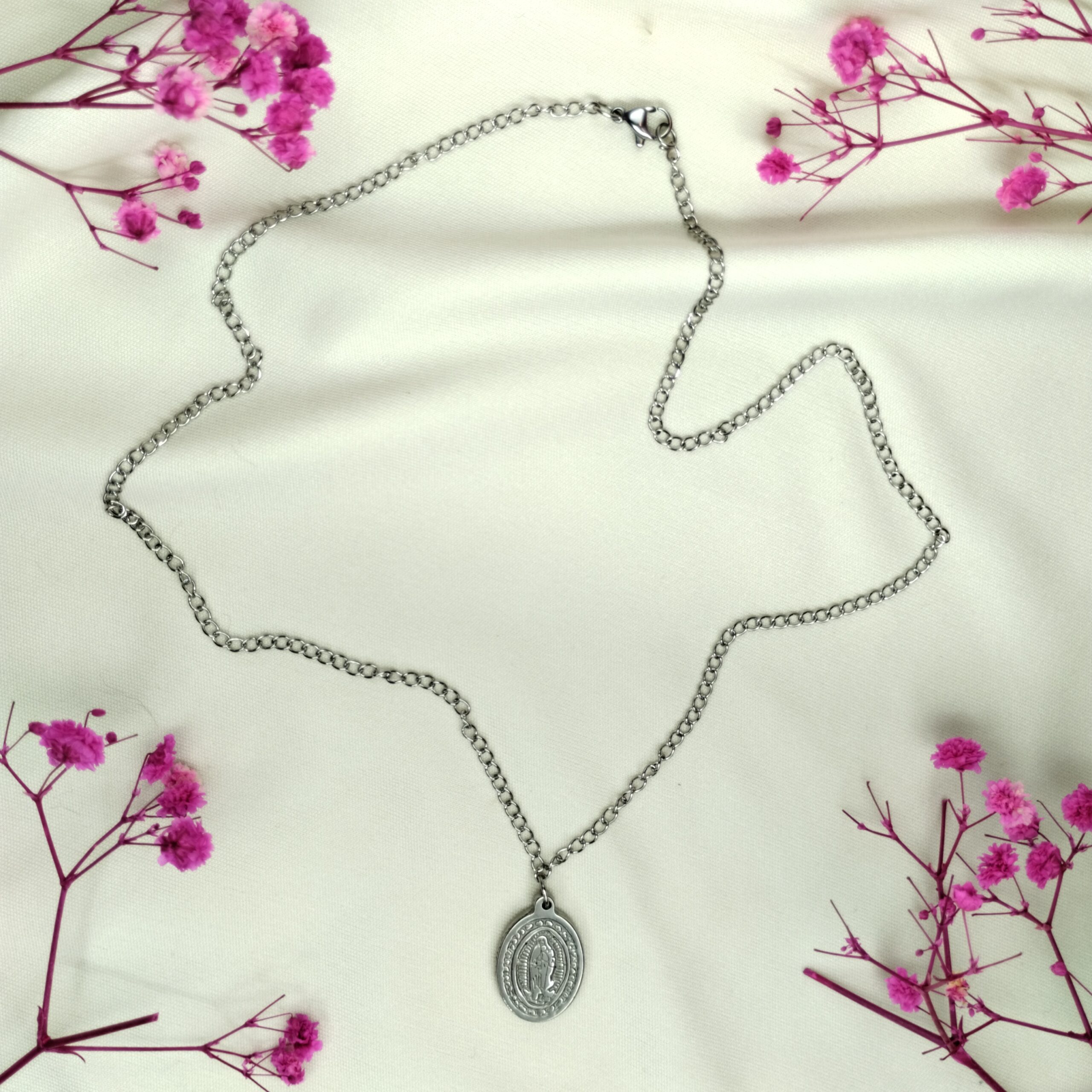 Naszyjnik „Królowa Pokoju” wykonany ze stali nierdzewnej, posrebrzanej.