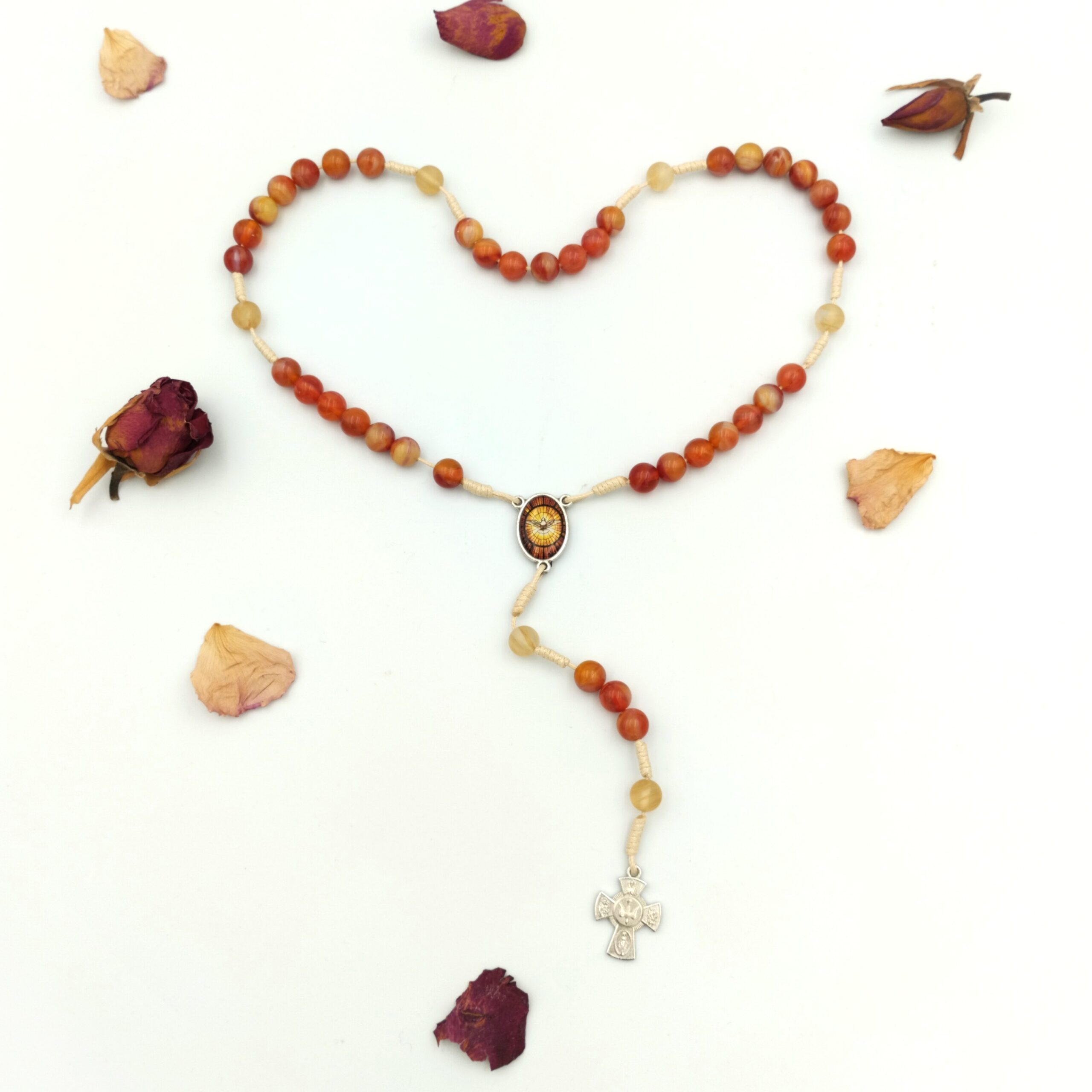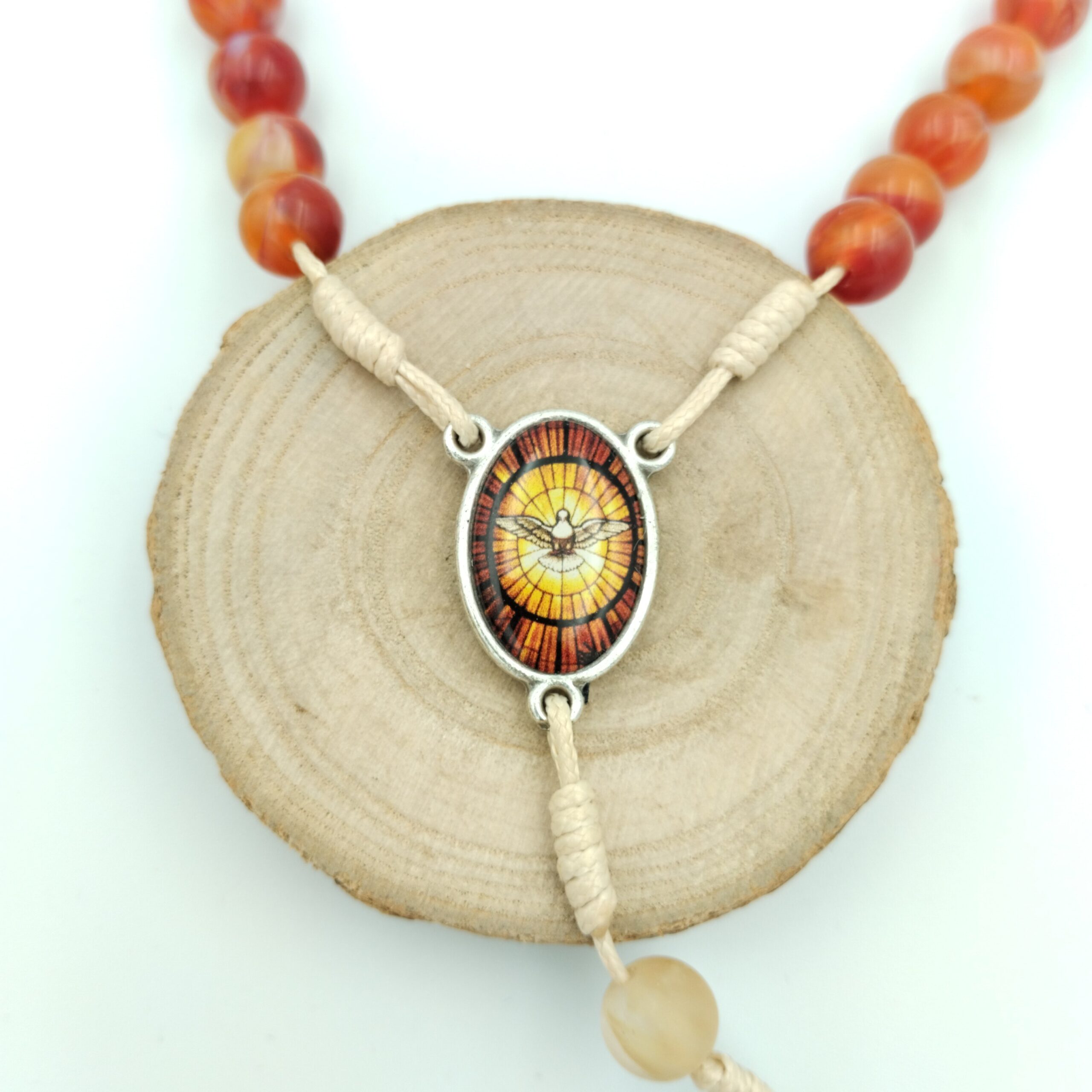 Duchu Święty, Przyjdź – różaniec 8 mm z pomarańczowo-miodowego agatu, z łącznikiem Ducha Świętego i metalowym krzyżem w kolorze srebra z wizerunkiem Ducha Świętego. Idealny jako pamiątka Bierzmowania i do codziennej modlitwy o dary Ducha Świętego.