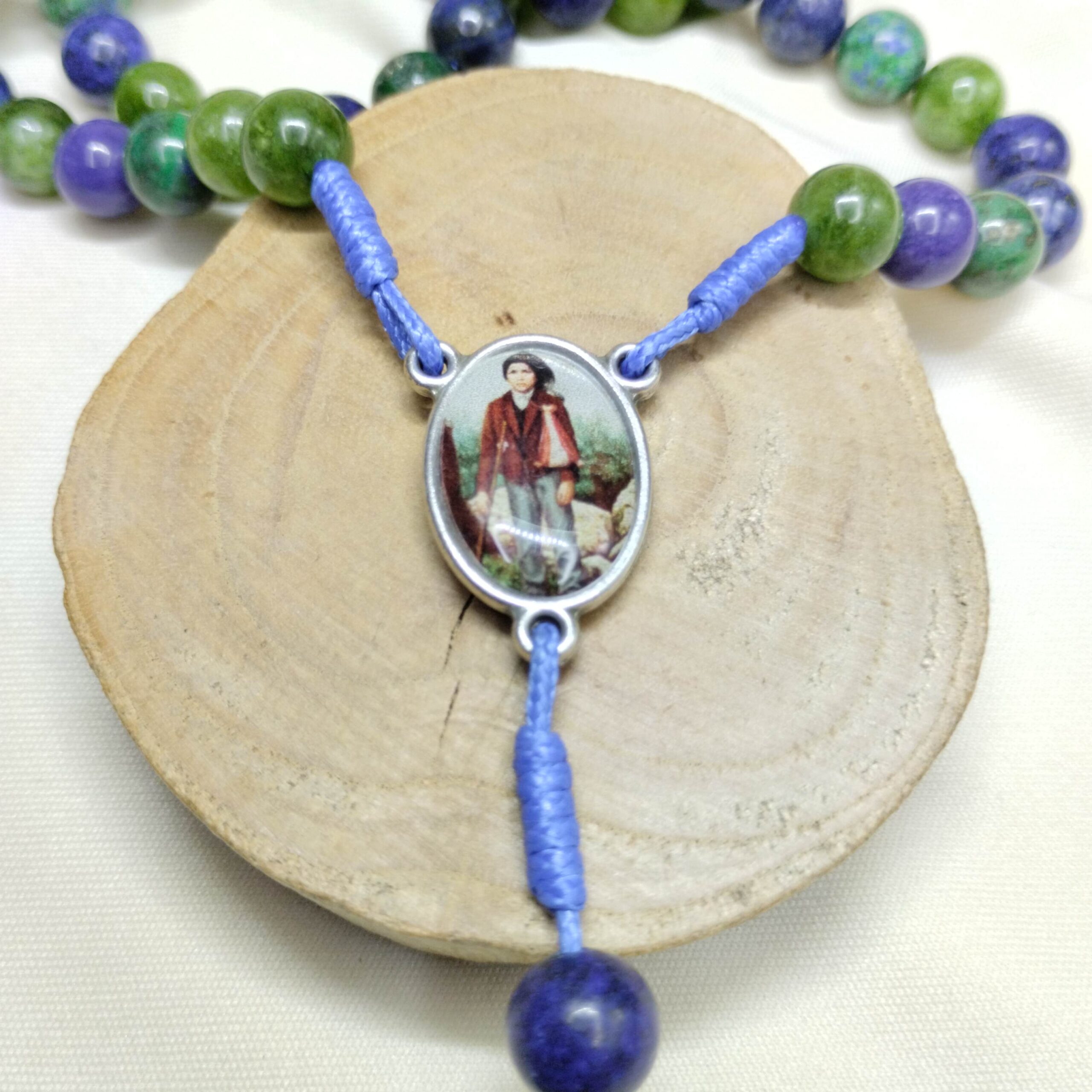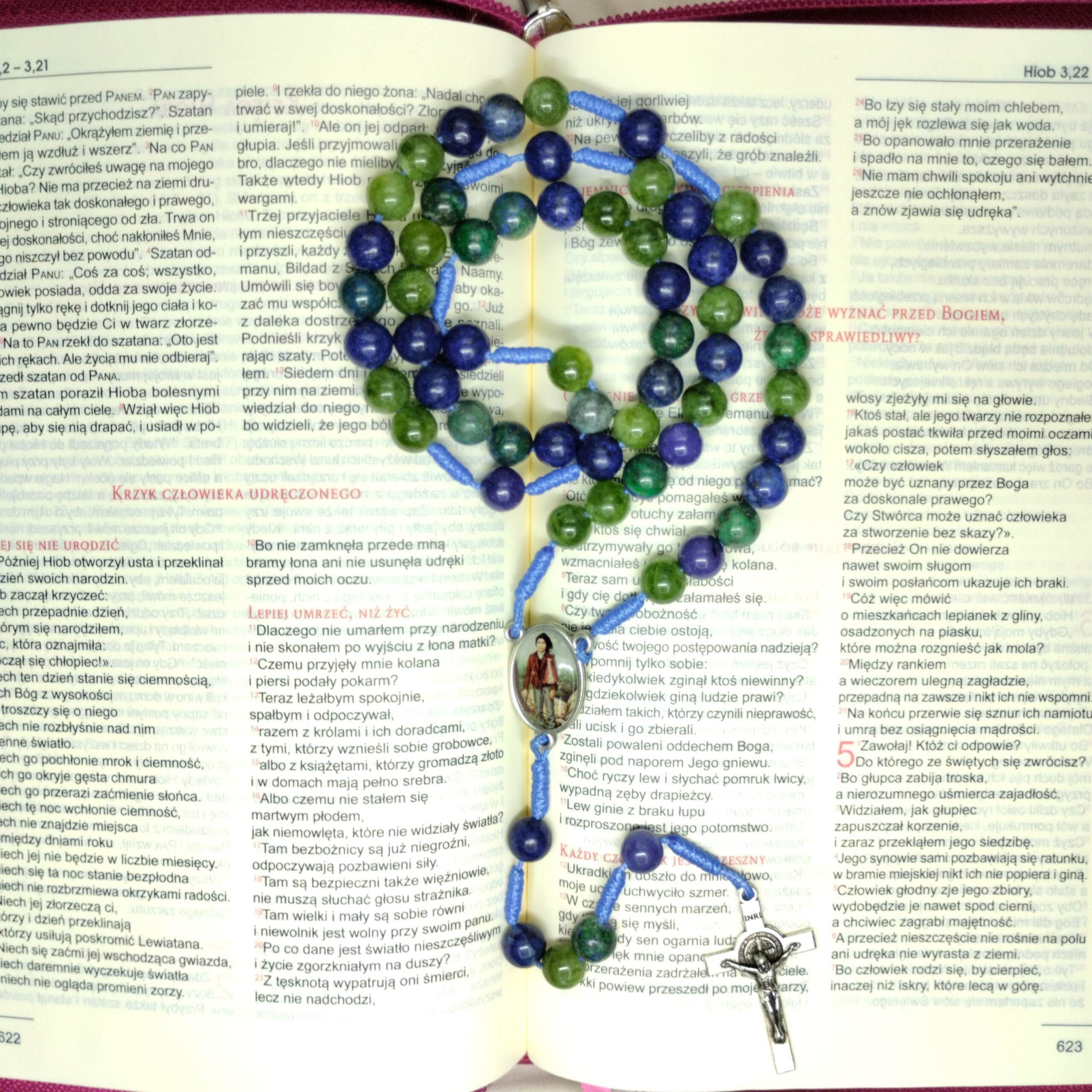„Dziecięctwo Ufności” to różaniec wykonany z naturalnych jadeitów o średnicy 8 mm – w kolorach zieleni i niebieskiego, które przywołują spokój, nadzieję oraz bliskość stworzenia z jego Stwórcą. Każdy kamień jest wyjątkowy, tak jak każda modlitwa wypowiadana z serca.