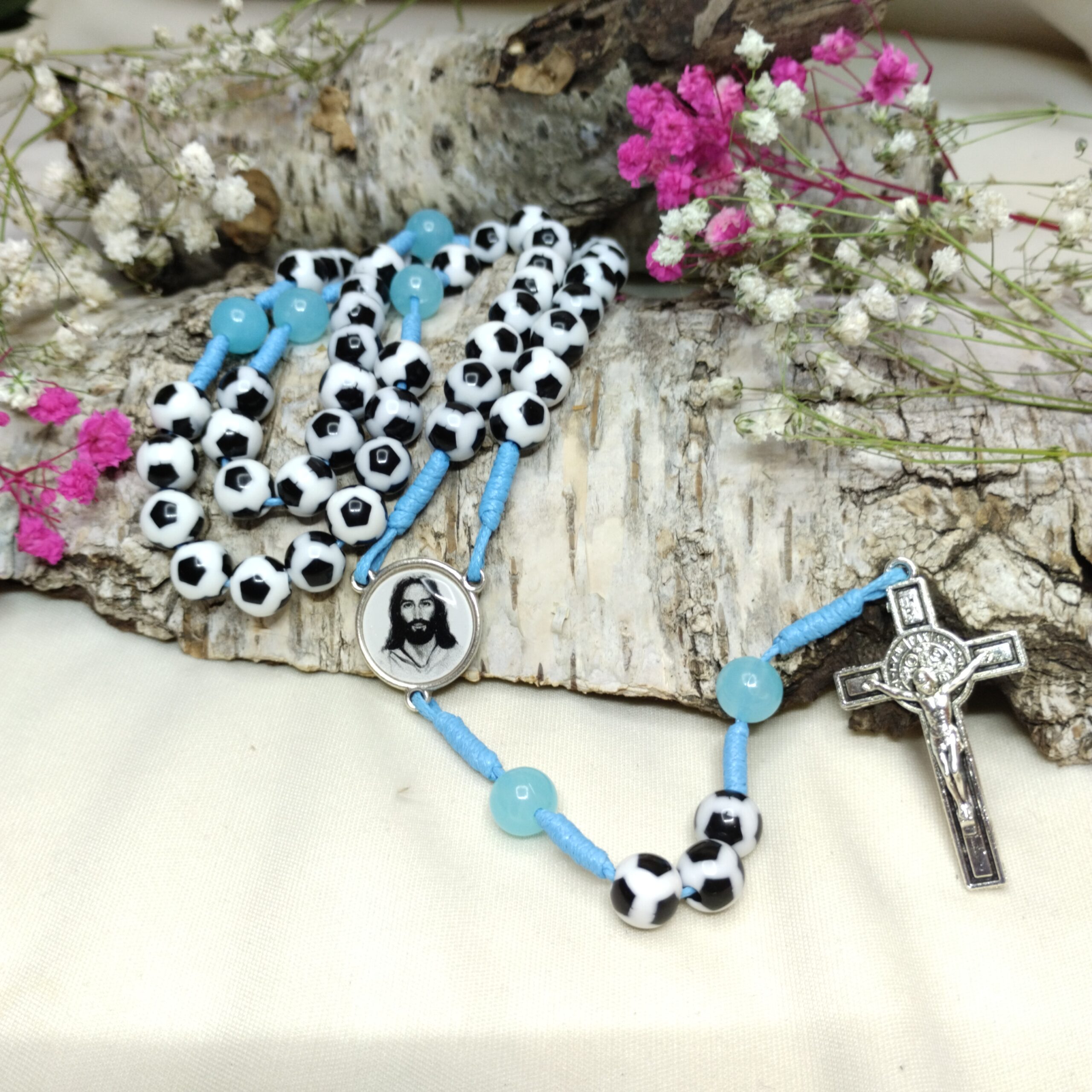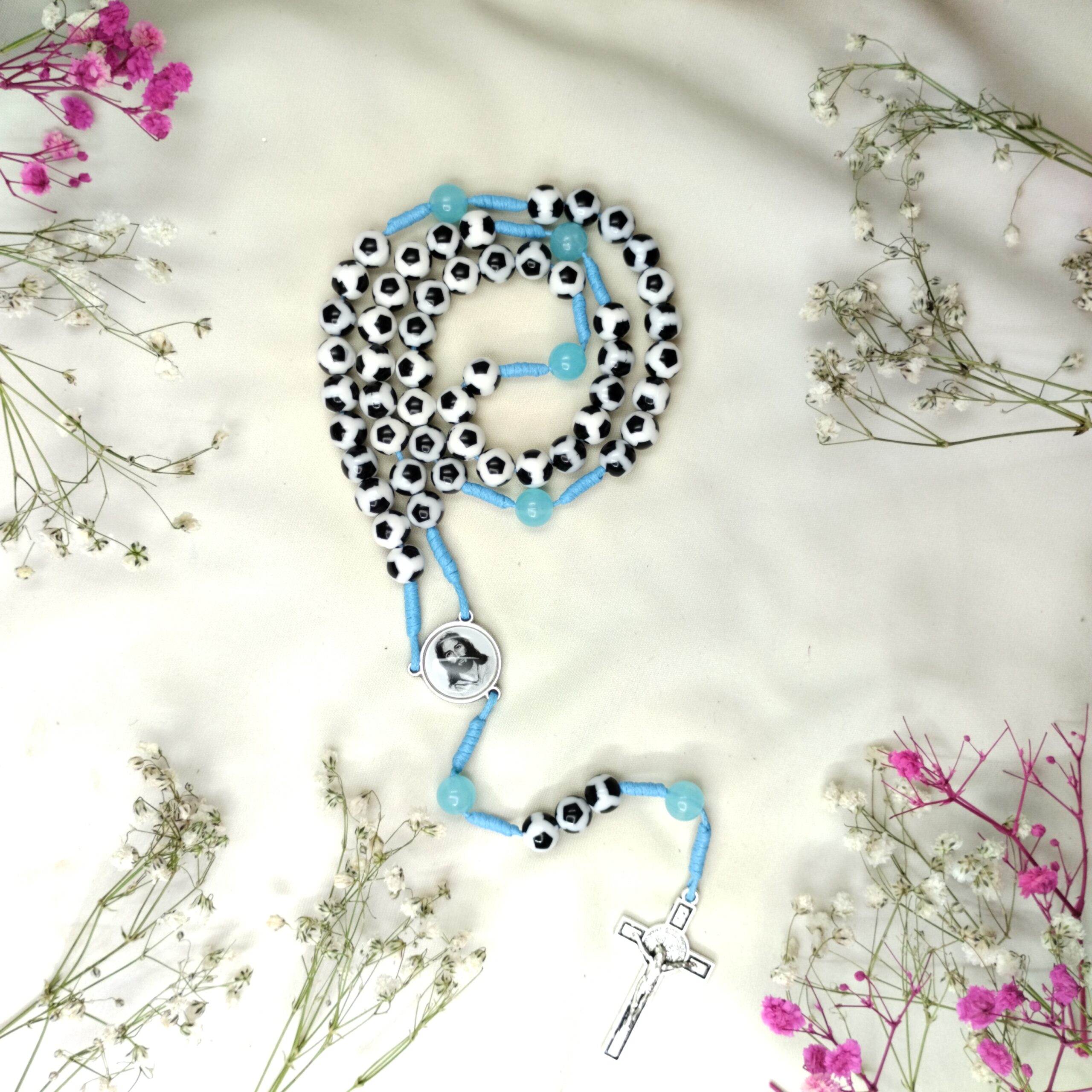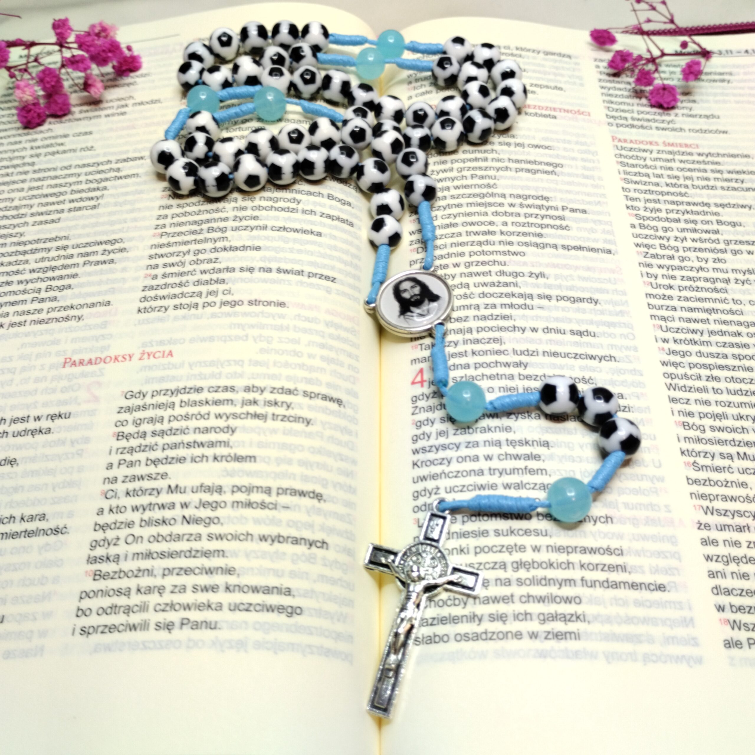 Ten wyjątkowy różaniec to połączenie piłki nożnej, modlitwy i wiary, które zachęci każde dziecko do rozwoju nie tylko na boisku, ale również w duchowym życiu. Paciorki o średnicy 8 mm w kształcie piłki nożnej z pewnością przypadną do gustu młodym piłkarzom, a akrylowe, niebieskie paciorki w miejscu „Ojcze Nasz” dodają mu wyjątkowego charakteru.
