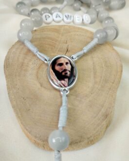 Różaniec 8mm „Jezus Miłosierny” wykonany z 8mm jadeitu w kolorze szarości.