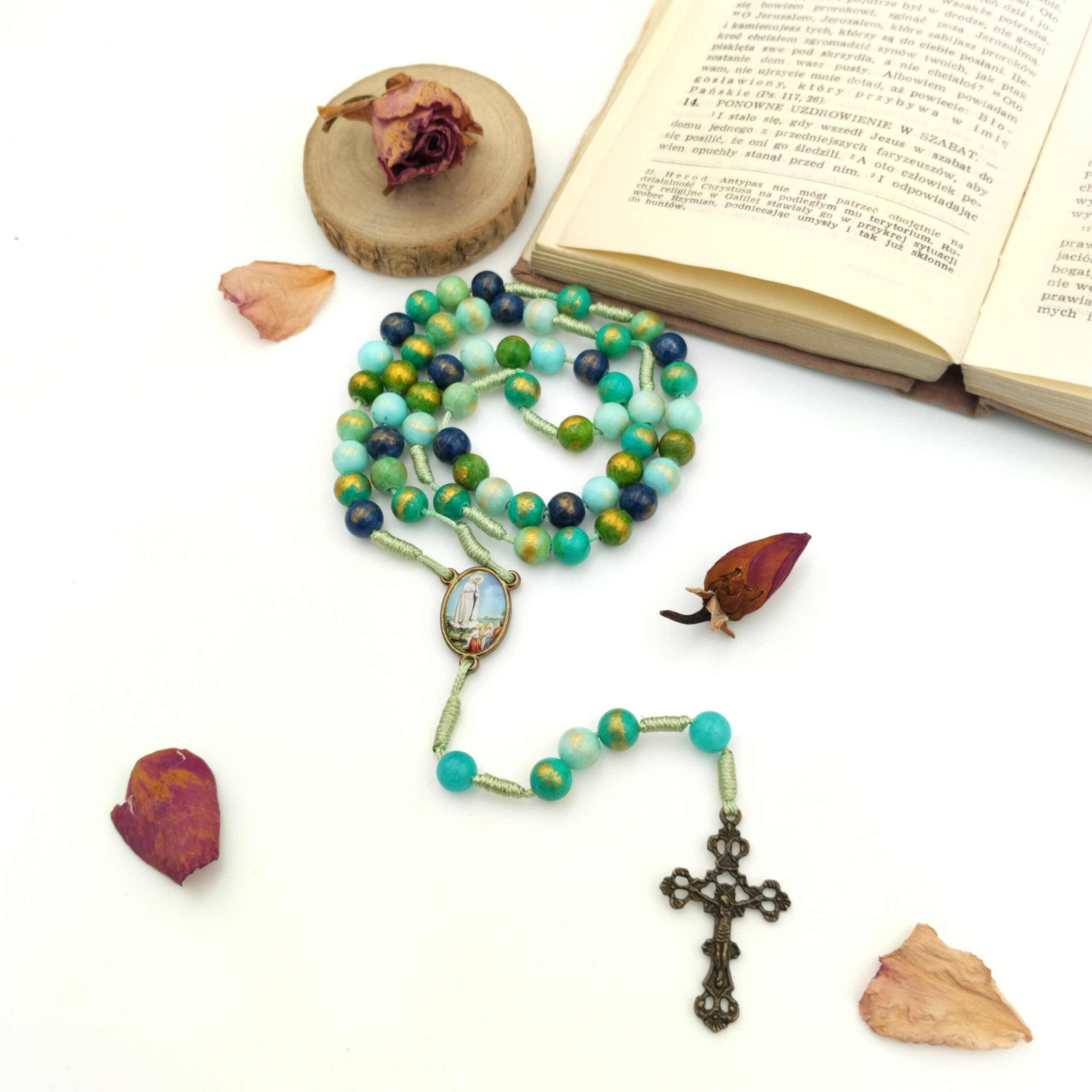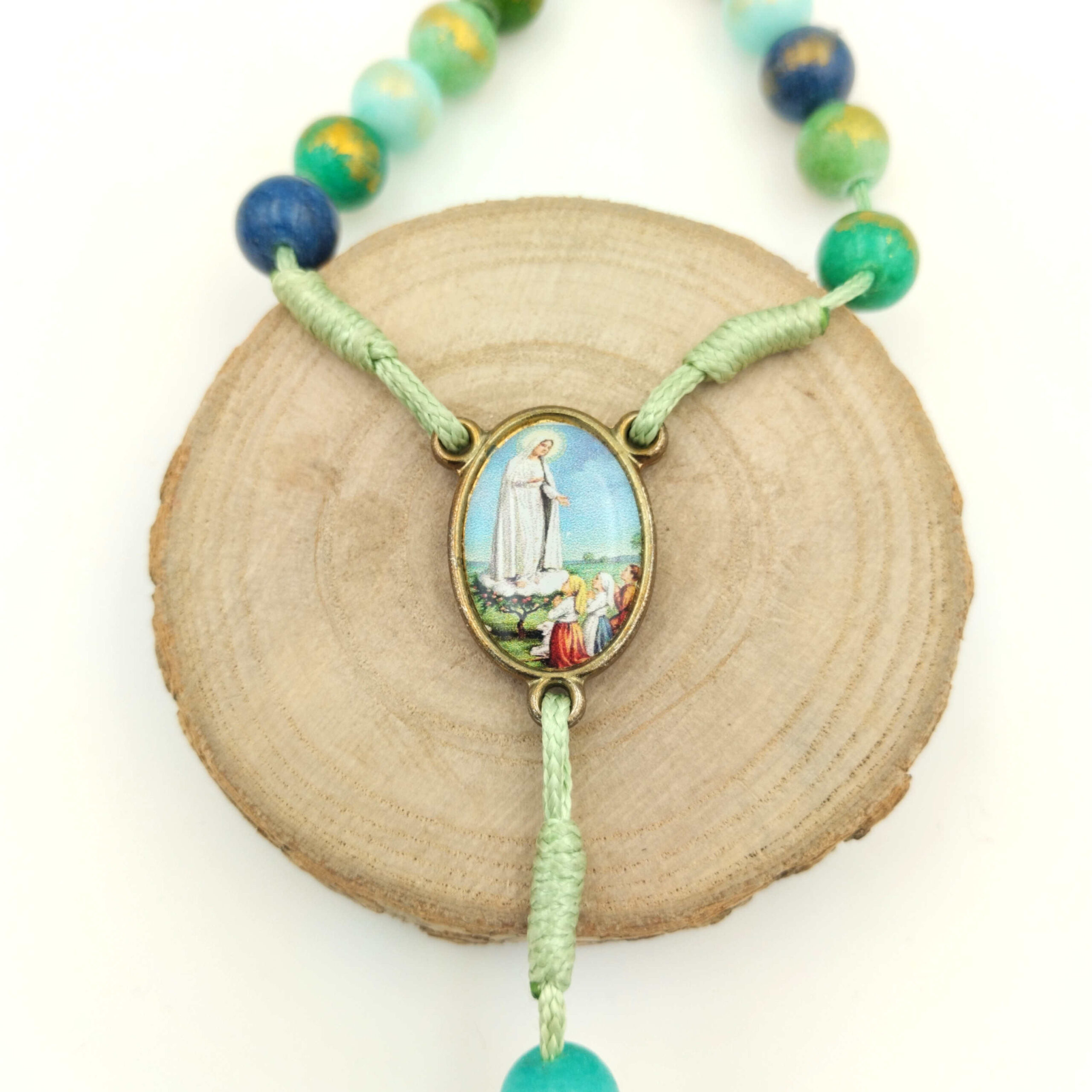 Różaniec 8mm „Matka Boża i Pastuszkowie z Fatimy” został wykonany z kamienia naturalnego, jadeitu, chalcedonu, 8mm. W odcieniach mięty, turkusu ,zieleni oraz granatu muśniętych złotem.