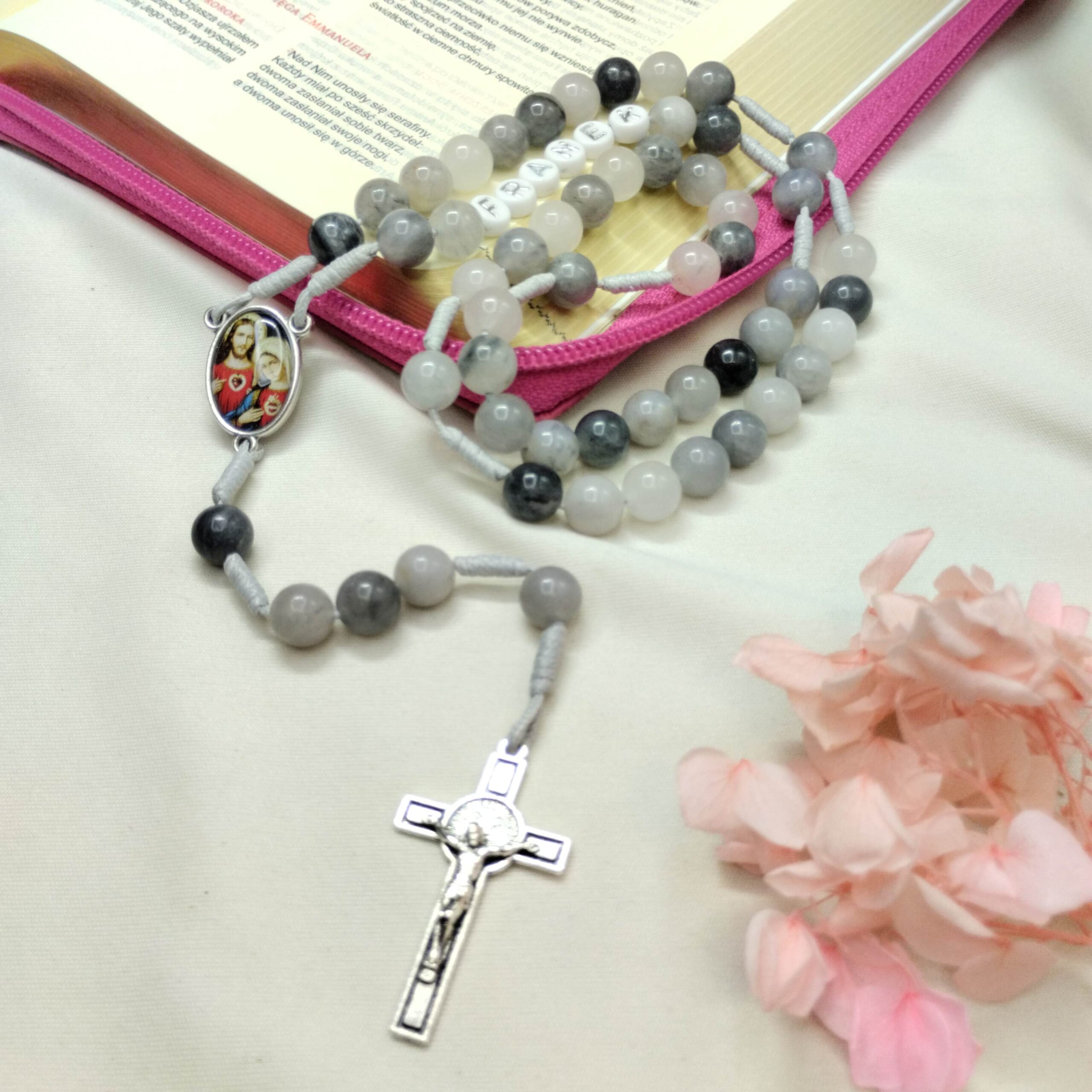 Różaniec 8mm „Przymierze Serc” z pięknego szaro-czarnego agatu.