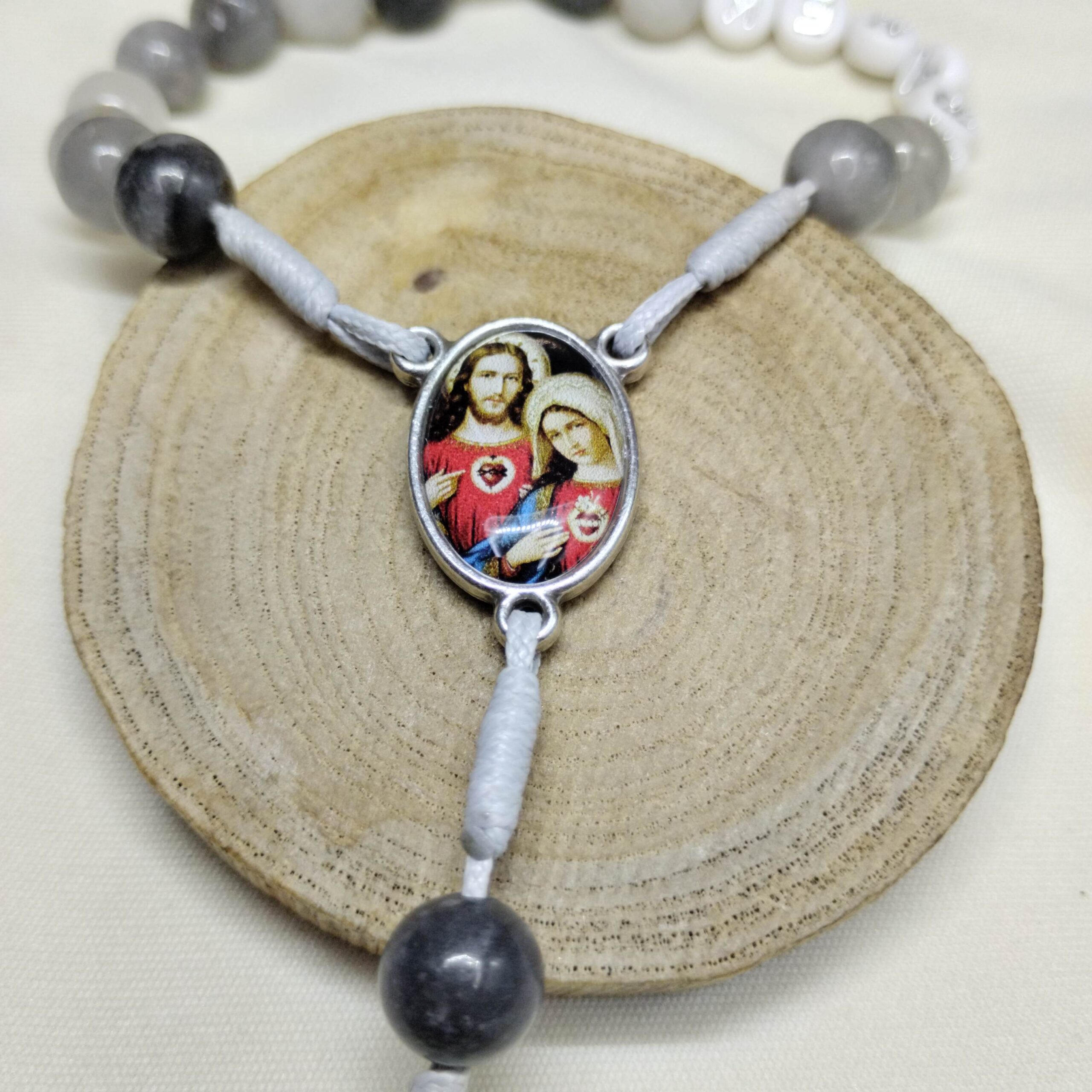 W centrum znajduje się metalowy łącznik z wizerunkiem Serca Jezusa i Serca Maryi – przypomnienie, że to właśnie w Ich miłości człowiek odnajduje najgłębsze bezpieczeństwo. Różaniec wieńczy krzyż świętego Benedykta – znak duchowej obecności i ochrony. Oba elementy wykonane są z metalu w kolorze srebra.