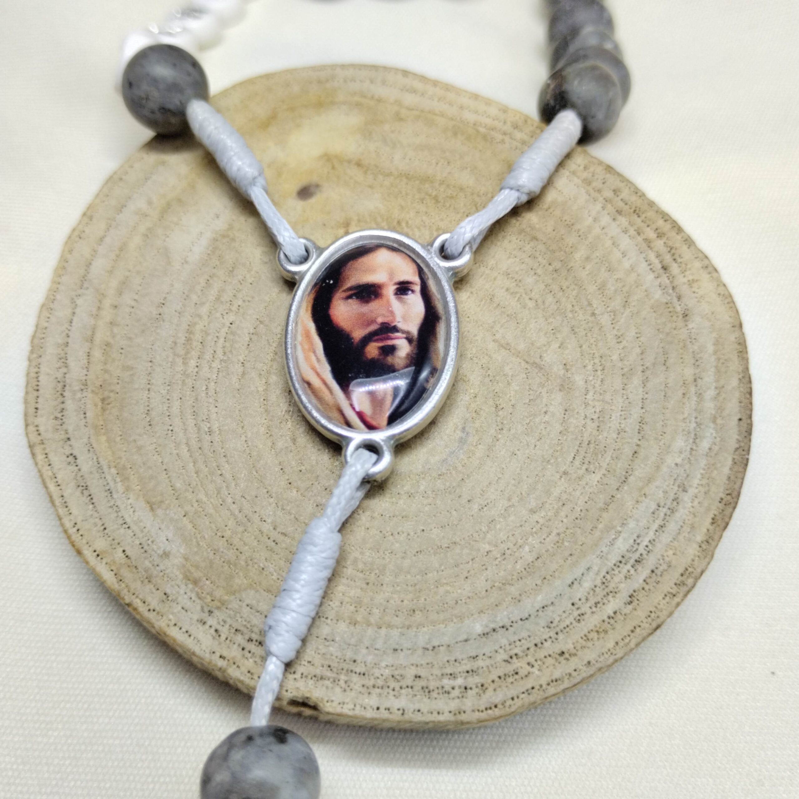 Metalowy łącznik z wizerunkiem Jezusa Chrystusa przypomina, komu powierzamy swoje życie. Krzyż świętego Benedykta, również metalowy, w kolorze srebra, niesie ze sobą znak wiary, odwagi i zaufania. Oba elementy podkreślają prostotę i głębię tej formy modlitwy.