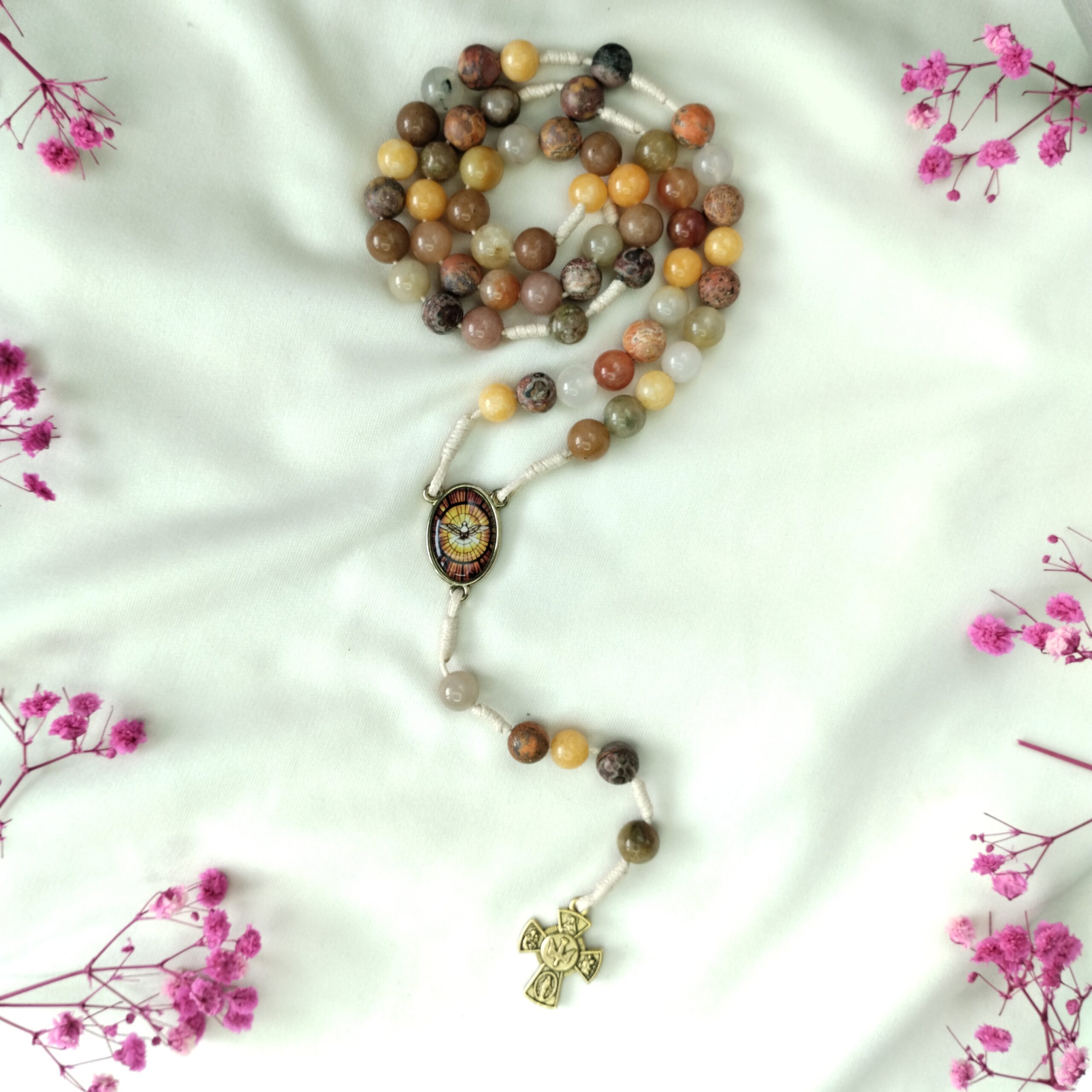 Odkryj piękno modlitwy prowadzonej w blasku Ducha Świętego dzięki różańcowi „W odcieniach Pocieszyciela”. Wykonany z naturalnych kamieni agatu, jadeitu i jaspisu, zachwyca ciepłymi barwami jesieni – od miodowych brązów i złocistych akcentów po łagodne barwy karmelowe. Każdy kamień jest wyjątkowy, odzwierciedlając harmonię stworzenia i duchową głębię, w rozmiarze 8mm.