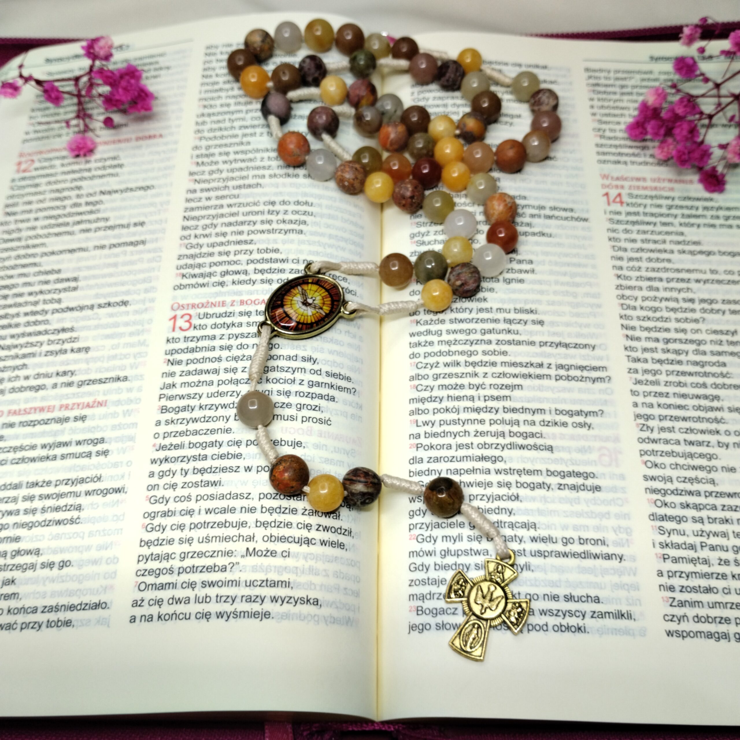 Nie tylko zachwyca swoją naturalną estetyką, ale także zachęca do głębokiej, osobistej modlitwy. Naturalne kamienie w połączeniu z wizerunkiem Ducha Świętego tworzą wyjątkową całość – prostą, ale pełną znaczenia. To idealny wybór zarówno dla tych, którzy szukają duchowego wyciszenia, jak i dla osób, które pragną obdarować bliskich czymś wyjątkowym.