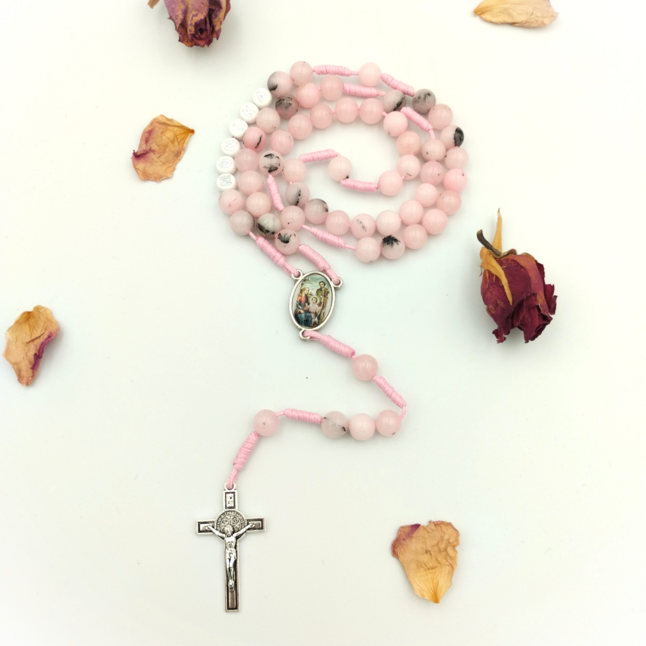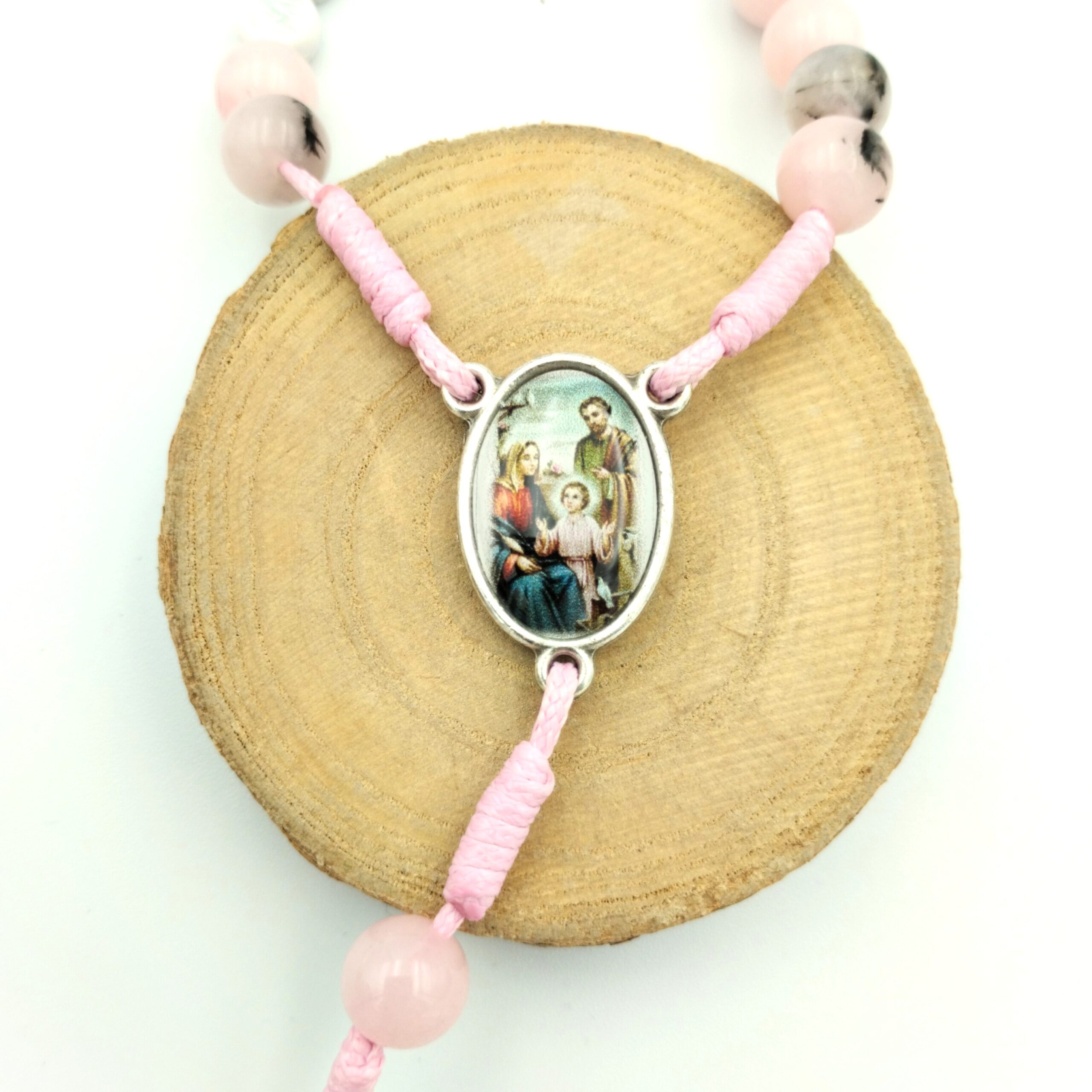 Różaniec 8mm „W Sercu Rodziny” wykonany z jadeitu opalowego w odcieniach pudrowego różu z delikatną domieszką czerni. Wizerunek Świętej Rodziny, krzyż św. Benedykta i różowy sznurek nadają mu ciepły, subtelny i głęboko katolicki charakter. To wyjątkowy różaniec dla osób, które pragną modlić się za swoich bliskich i powierzać Bogu swoją rodzinę.