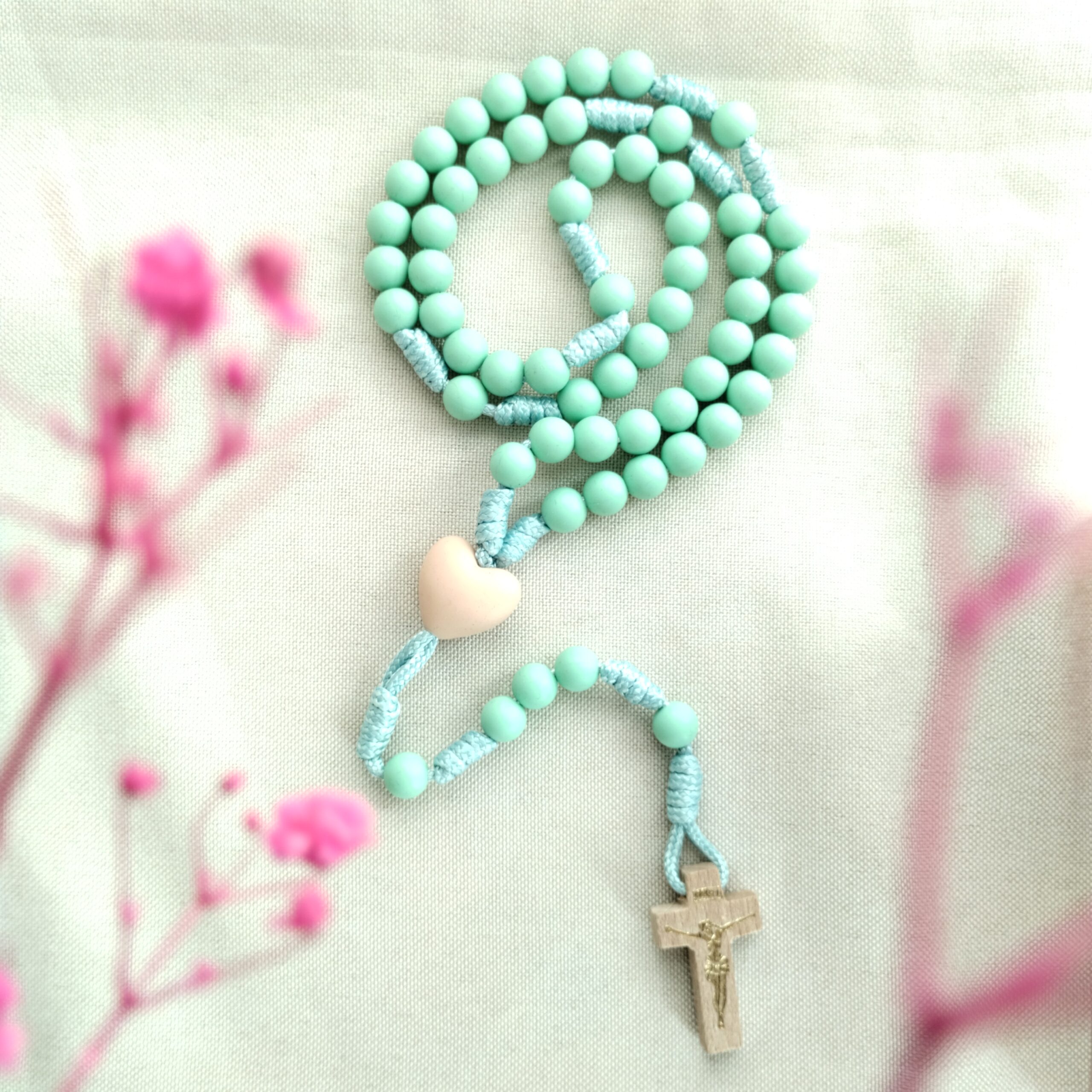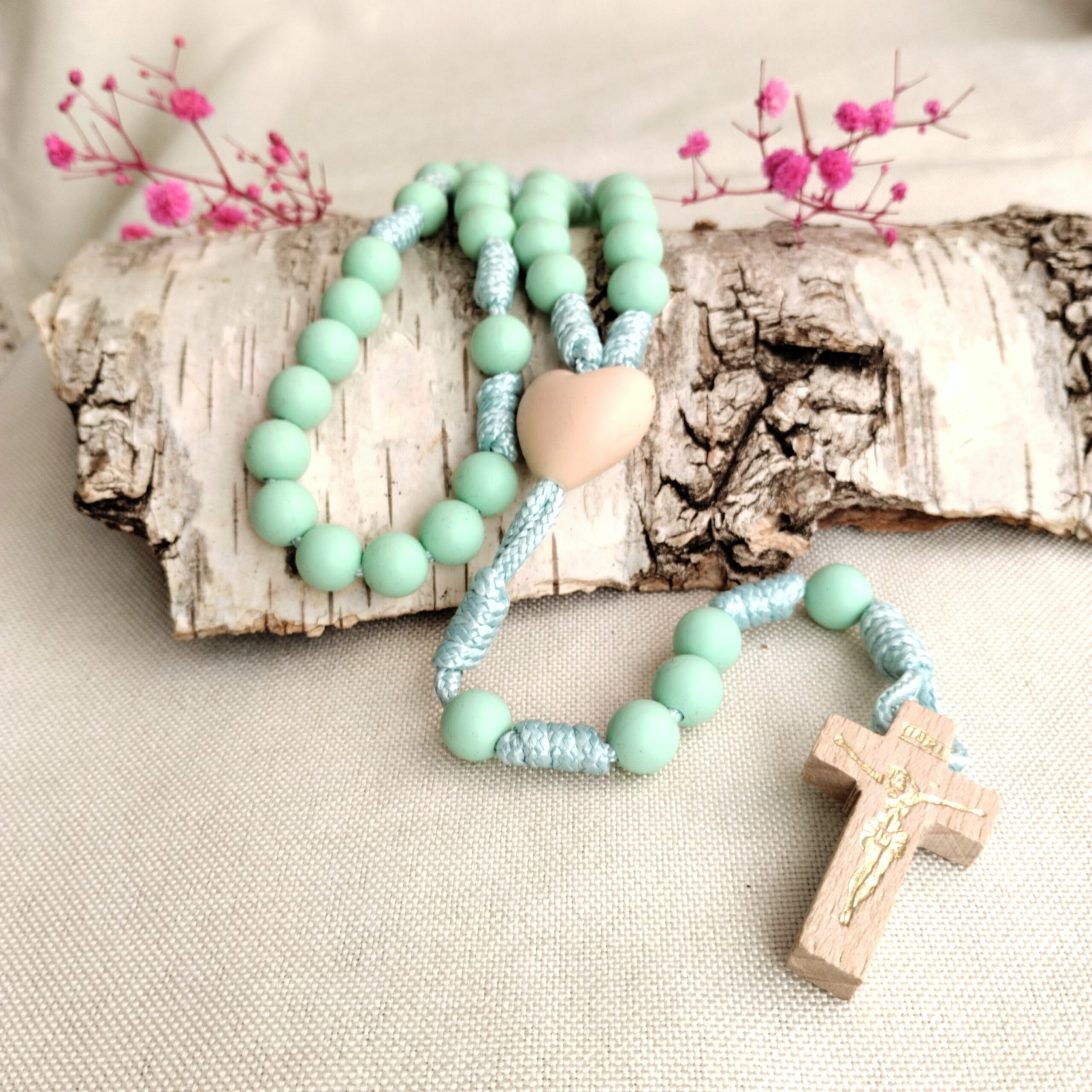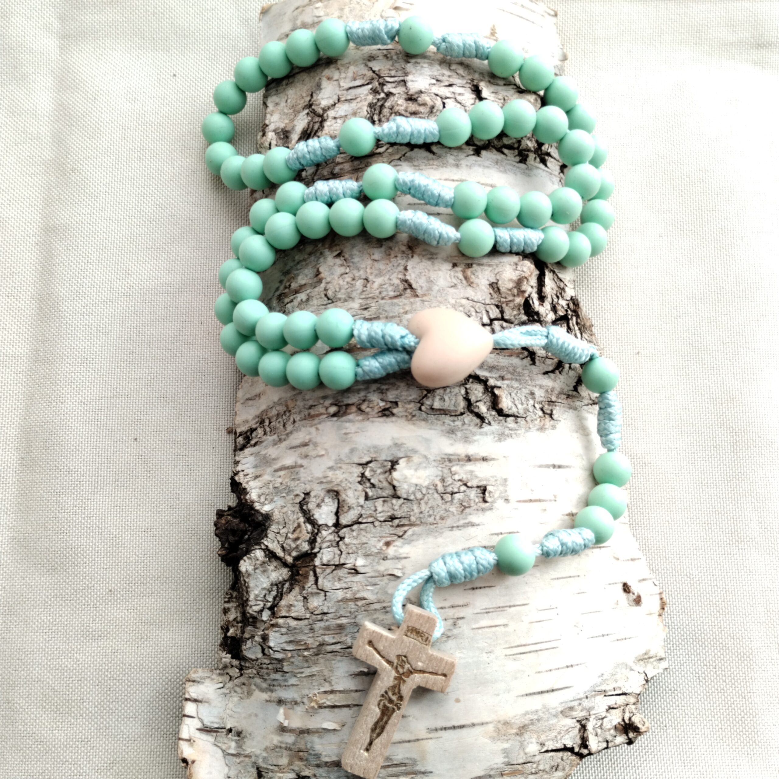 Został wykonany z paciorków silikonowych, 9mm. W kolorze miętowym. Serce beżowe, jako łącznik, 15mm. Drewniany, beżowy krzyż. Zapleciony został na turkusowym sznurku.
