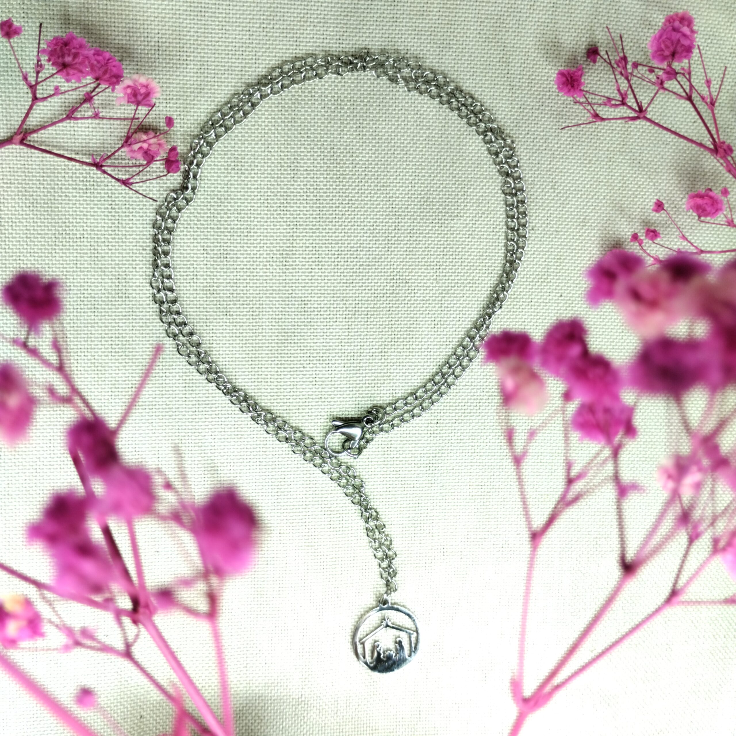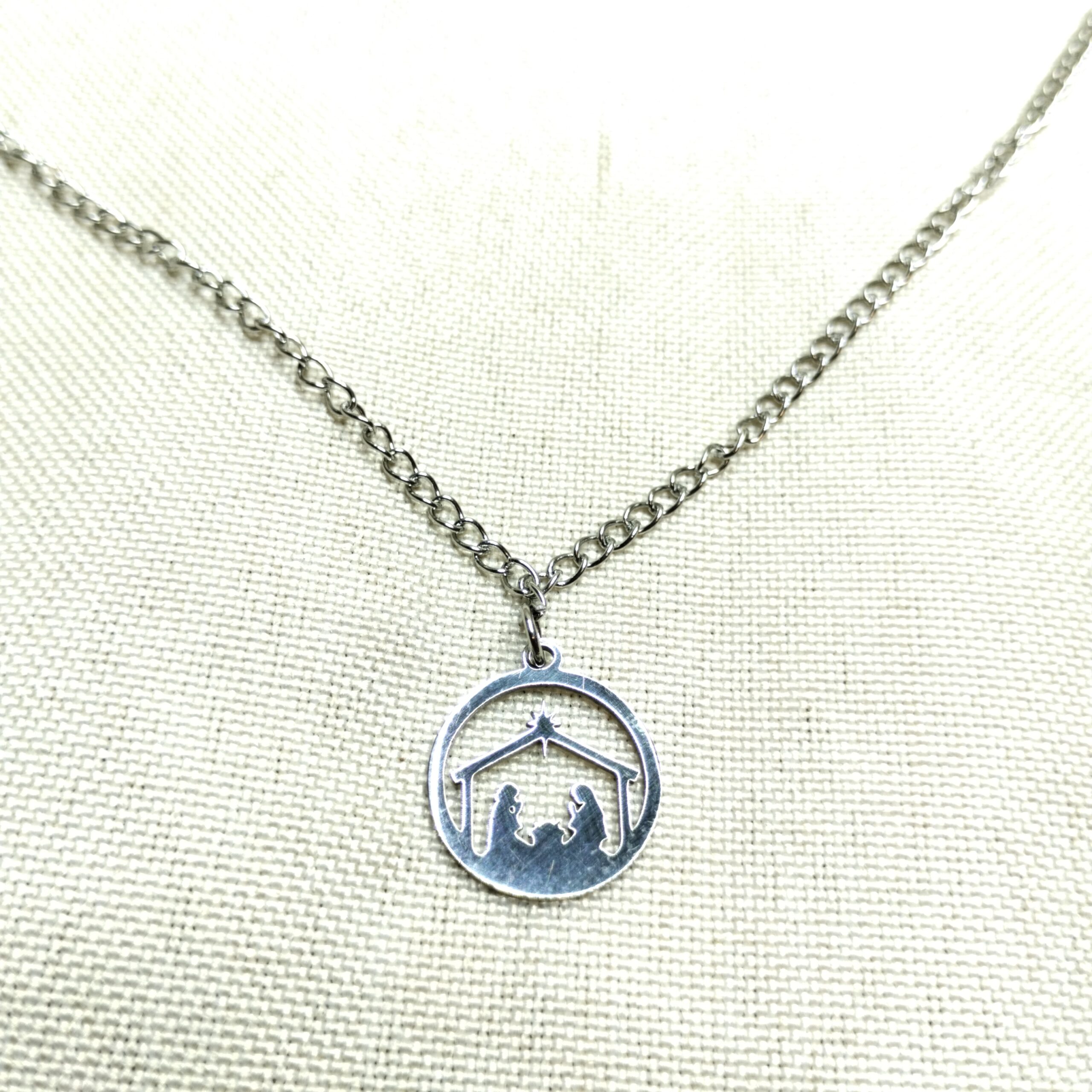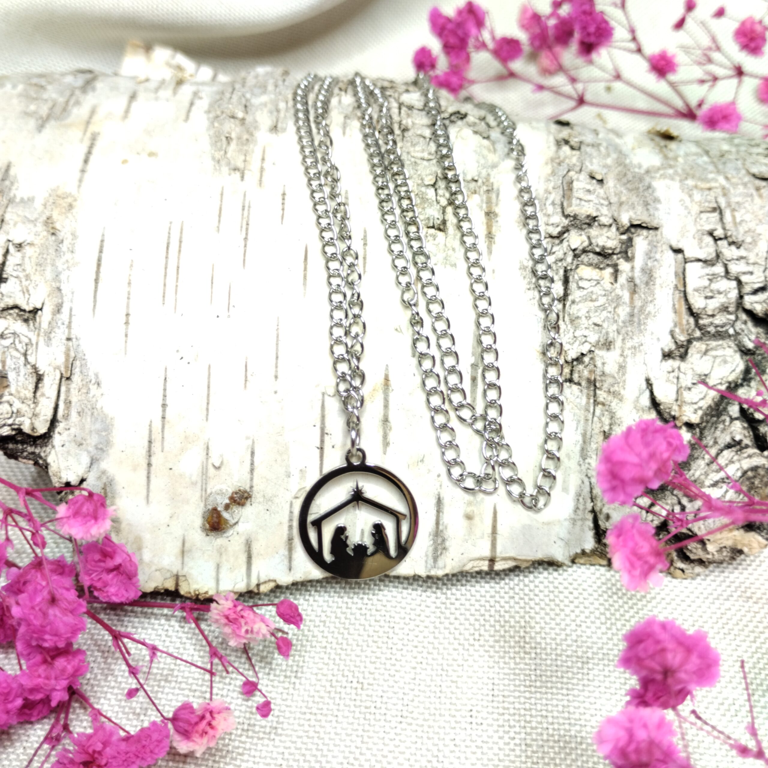 Naszyjnik stal nierdzewna, posrebrzana z motywem szopki betlejemskiej.
