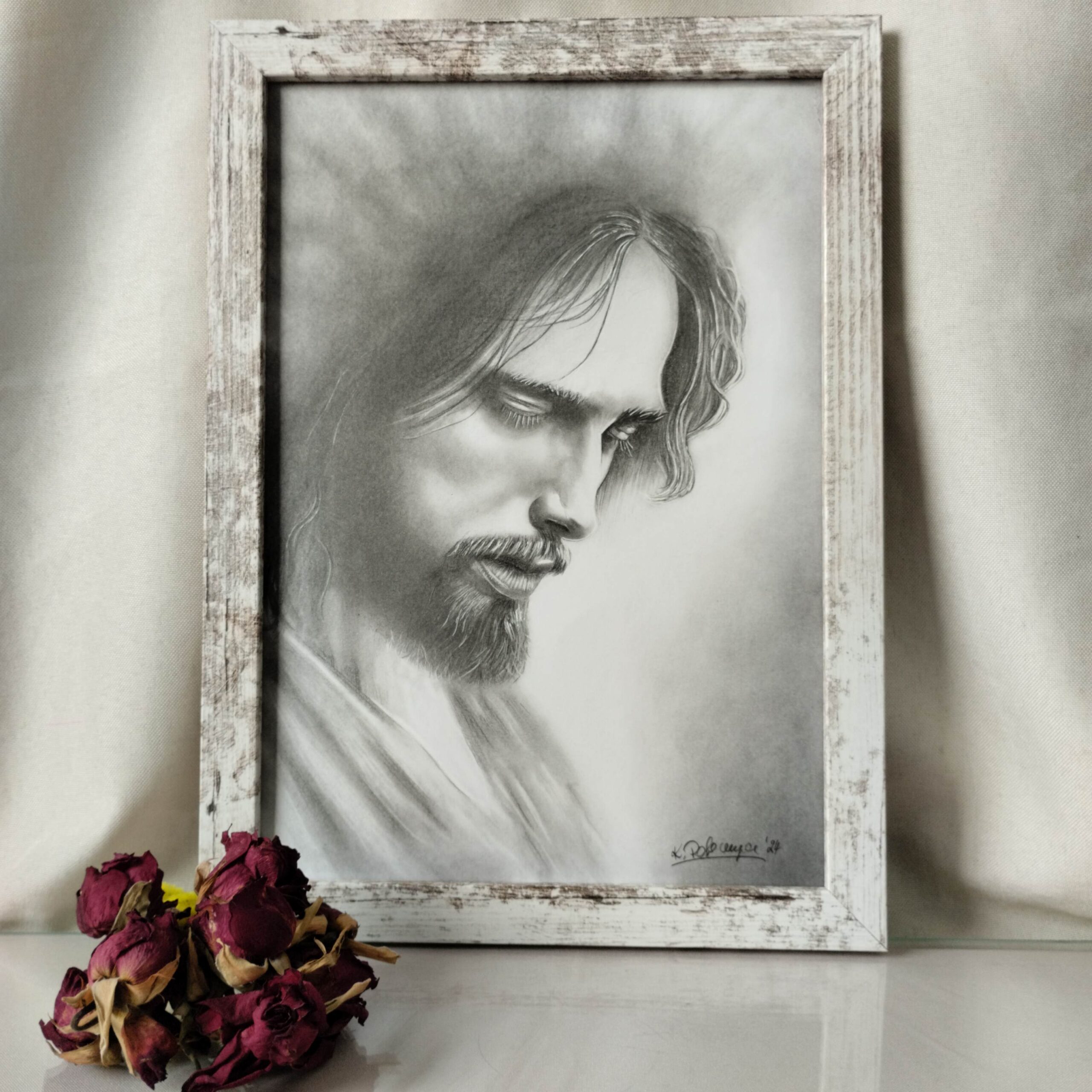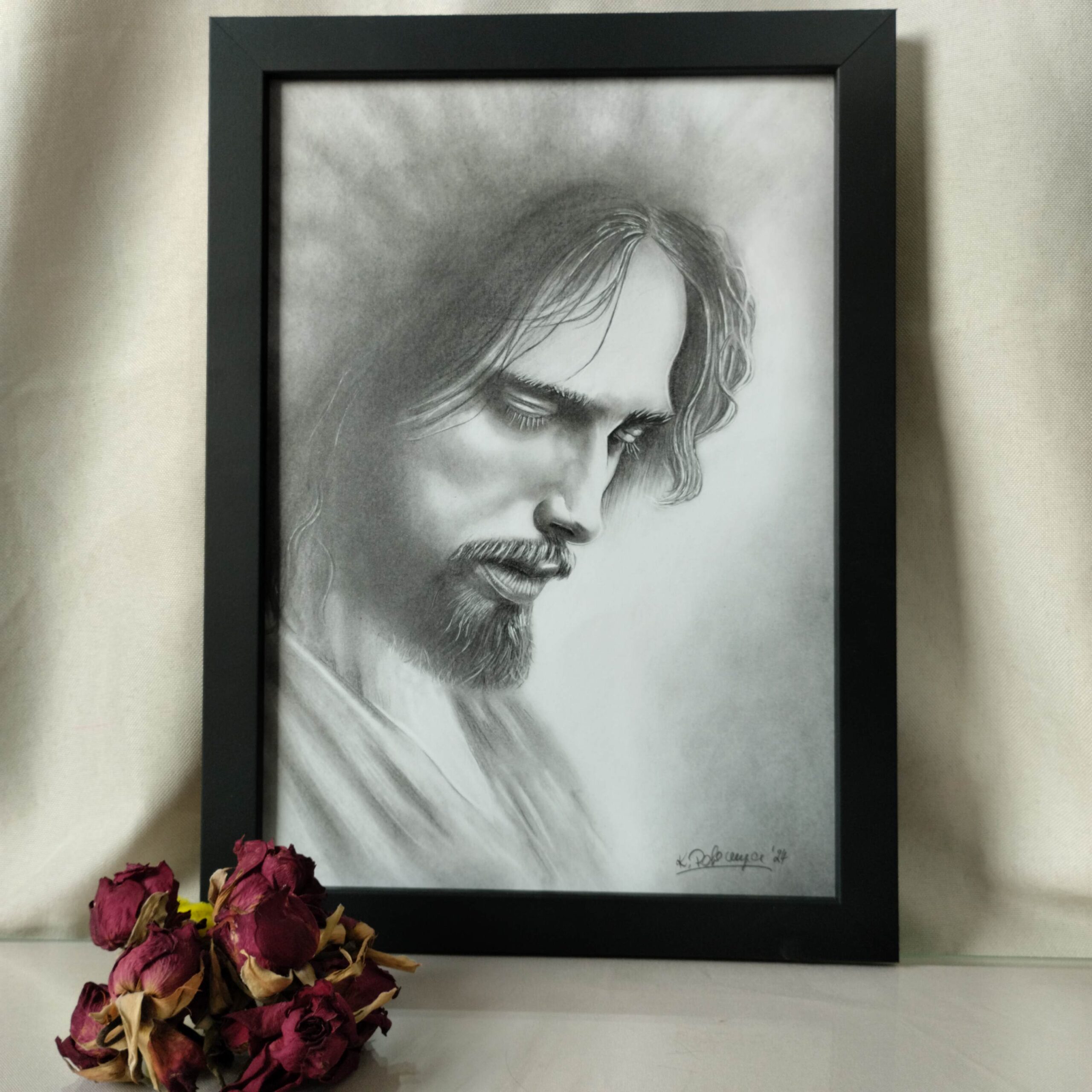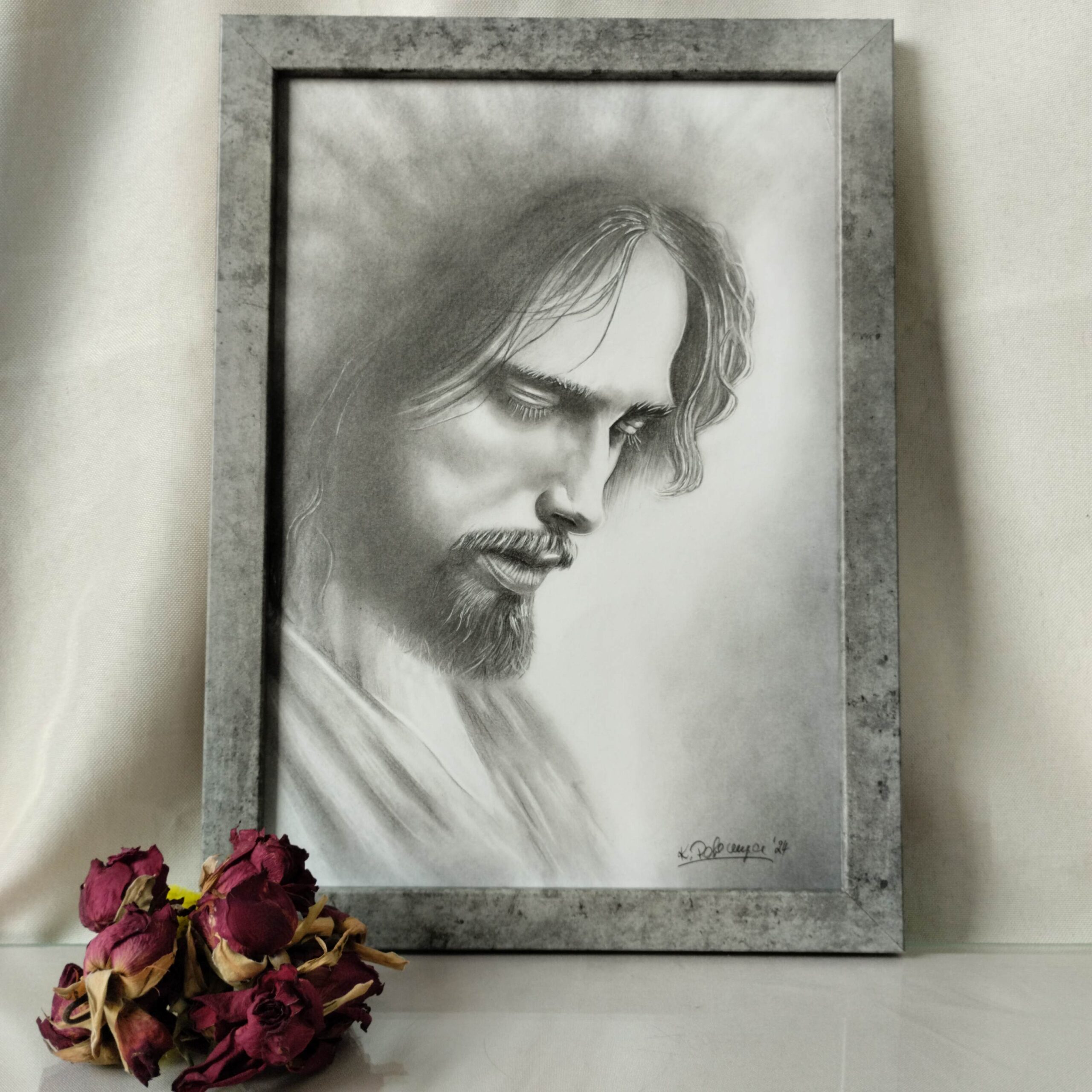 Ręcznie wykonany rysunek przedstawiający postać Jezusa Chrystusa, który przebywał w Ogrodzie Oliwnym modląc się do Boga Ojca. Obraz wykonany ołówkami  serii Koh-i-Noor Hardtmuth-1500 na papierze Happy Color 250g. Praca wykonana z dbałością o detale z ramką w trzech odcieniach do wyboru:
