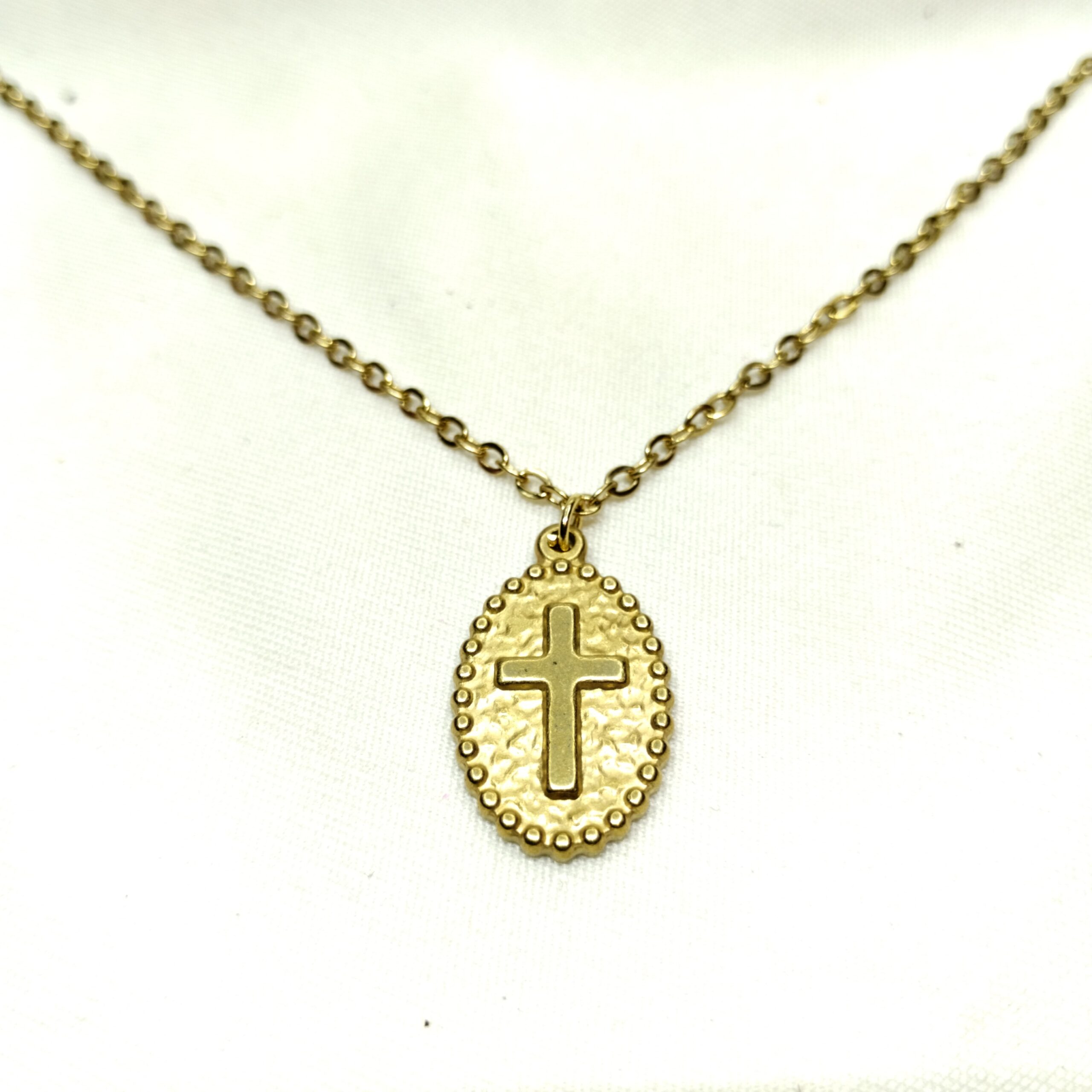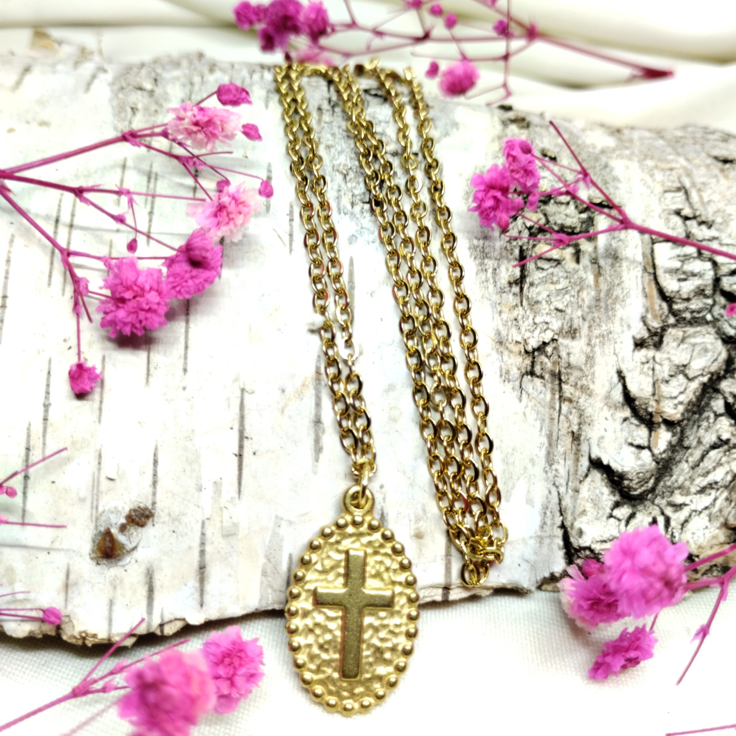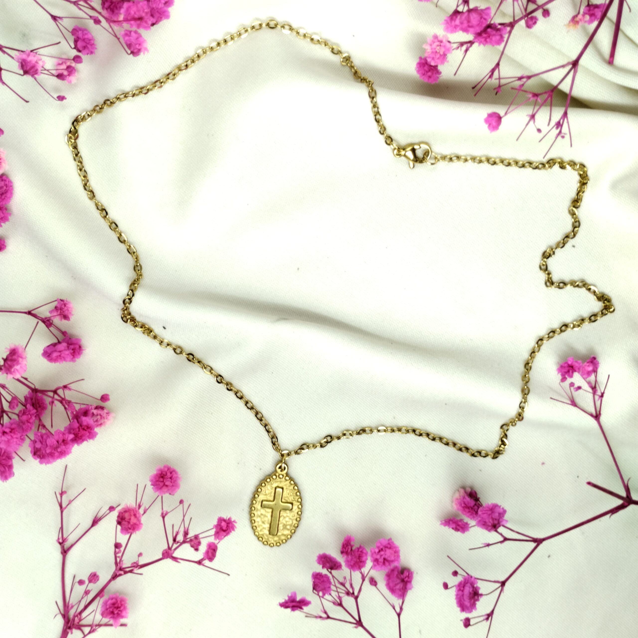 Motyw krzyża, umieszczony na łańcuszku, stanowi symbol najważniejszego elementu chrześcijańskiej wiary — drogi zbawienia, którą otworzył Jezus Chrystus przez swoją ofiarę na krzyżu. Jest to znak miłości, poświęcenia i nadziei, który przypomina o Bożej łasce i zbawieniu.
